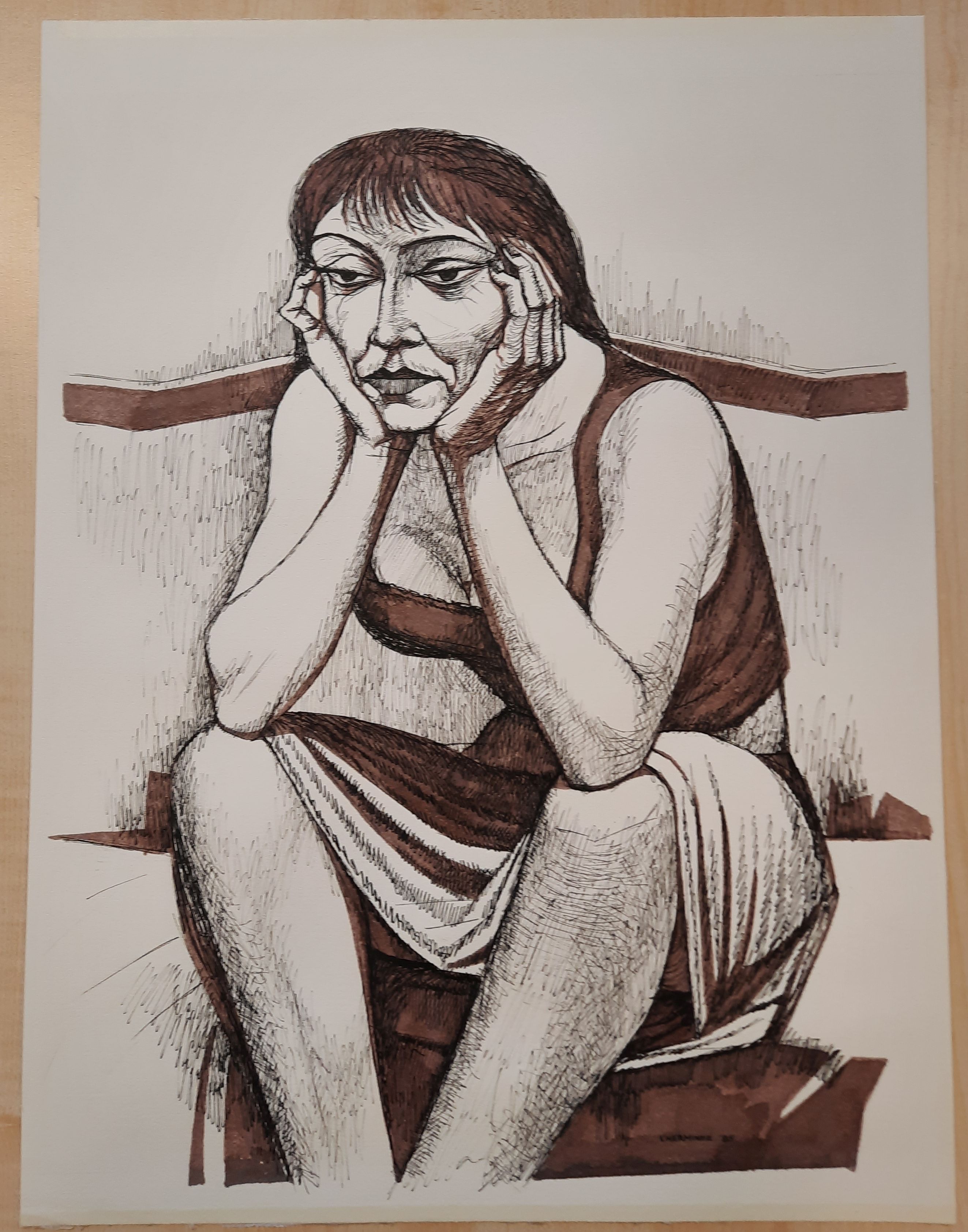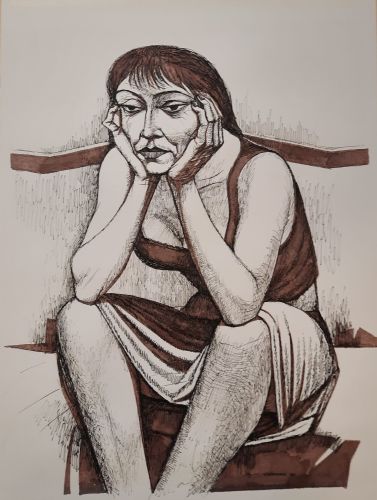 Zittende vrouw met hoofd in handen - 1985, geaquarelleerde Oostindische inkt/papier, 440 x 350 mm, gesigneerd en gedateerd r. van m.o.: L'HERMINEZ '85