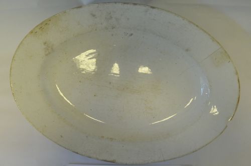Vleesschaal - z.j., witbakkend geglazuurd aardewerk, afmetingen: diameter 44 cm, op de onderzijde van de bodem gemerkt: 'Petrus Regout en Co MAASTRICHT' (niet omkaderd), blindstempel: '15' (beschadigd en verweerd) gemerkt: 'Petrus Regout en Co MAASTRICHT' (niet omkaderd), blindstempel: '15' (beschadigd en verweerd)