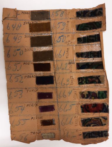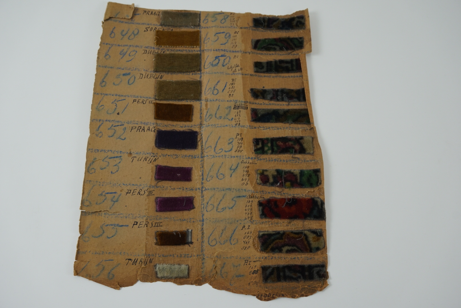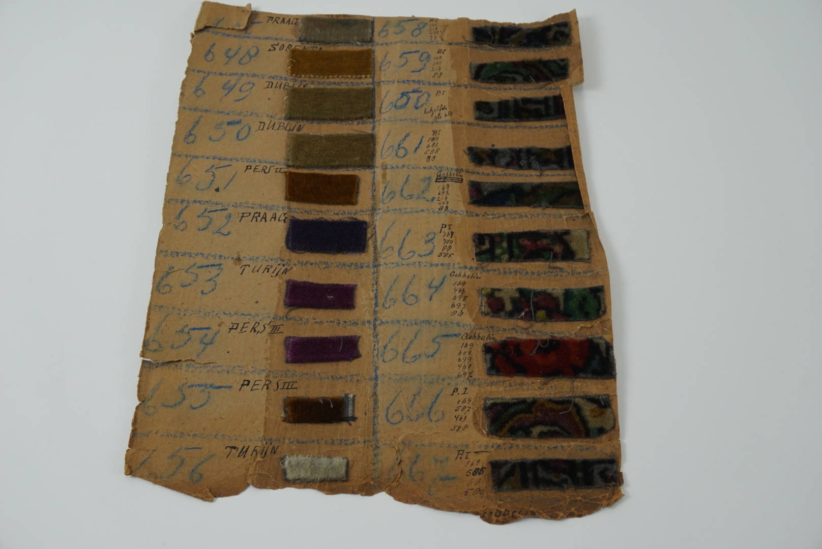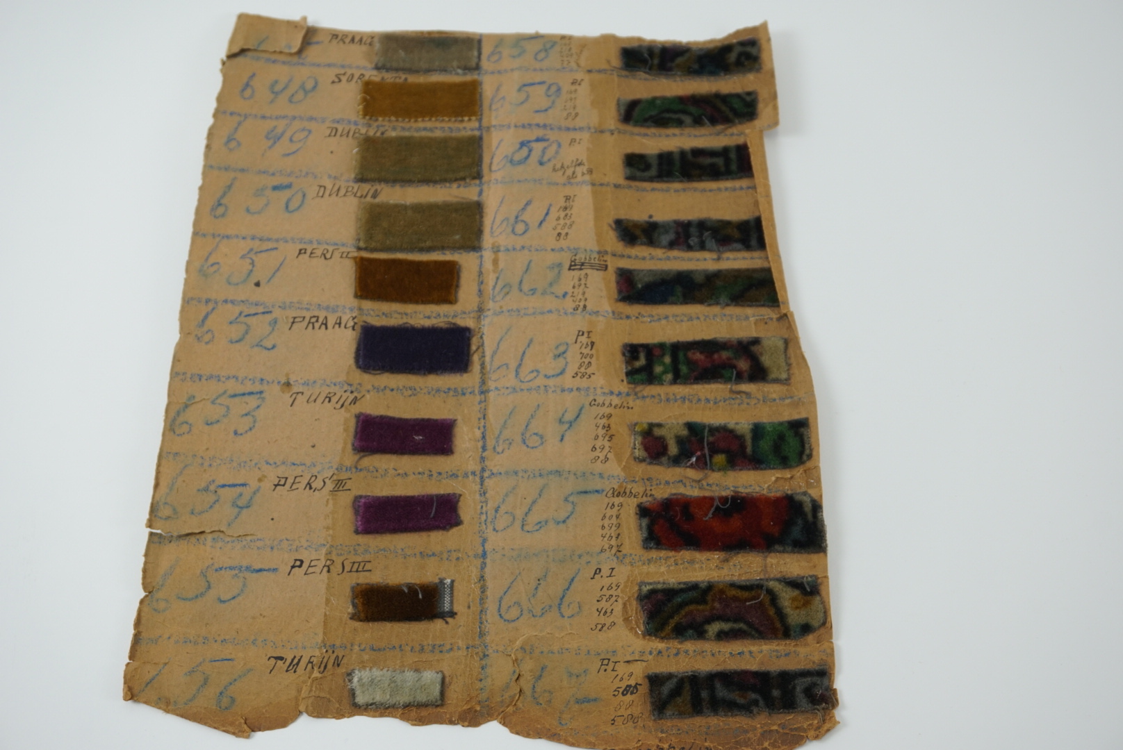 Fabrieksstalenboek met annotaties, materiaal: karton en velours, kleur: divers, lengte 45 cm, breedte 33 cm, in feite betreft het losse kartonvellen met opgeplakte monsters van velours stoffen, te weten: 647 Praag, 648 Sorento, 649 Dublin, 650 Dublin, 651 Perz II, 652 Praag, 653 turijn, 654 Pers III, 655 Pers III, 656 Turijn, 658 PI zilver ...