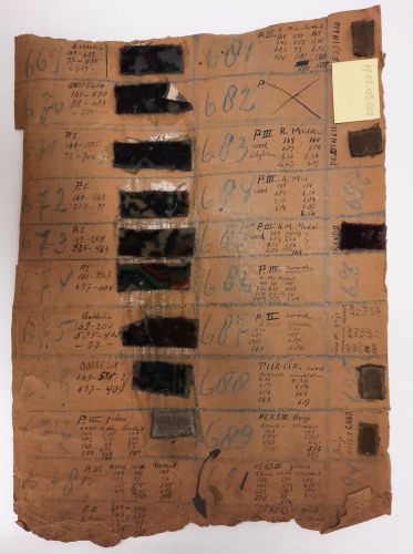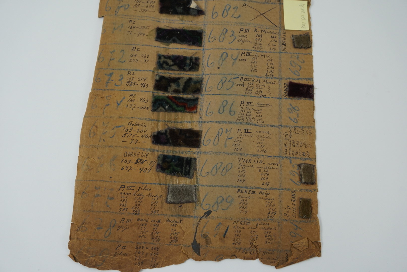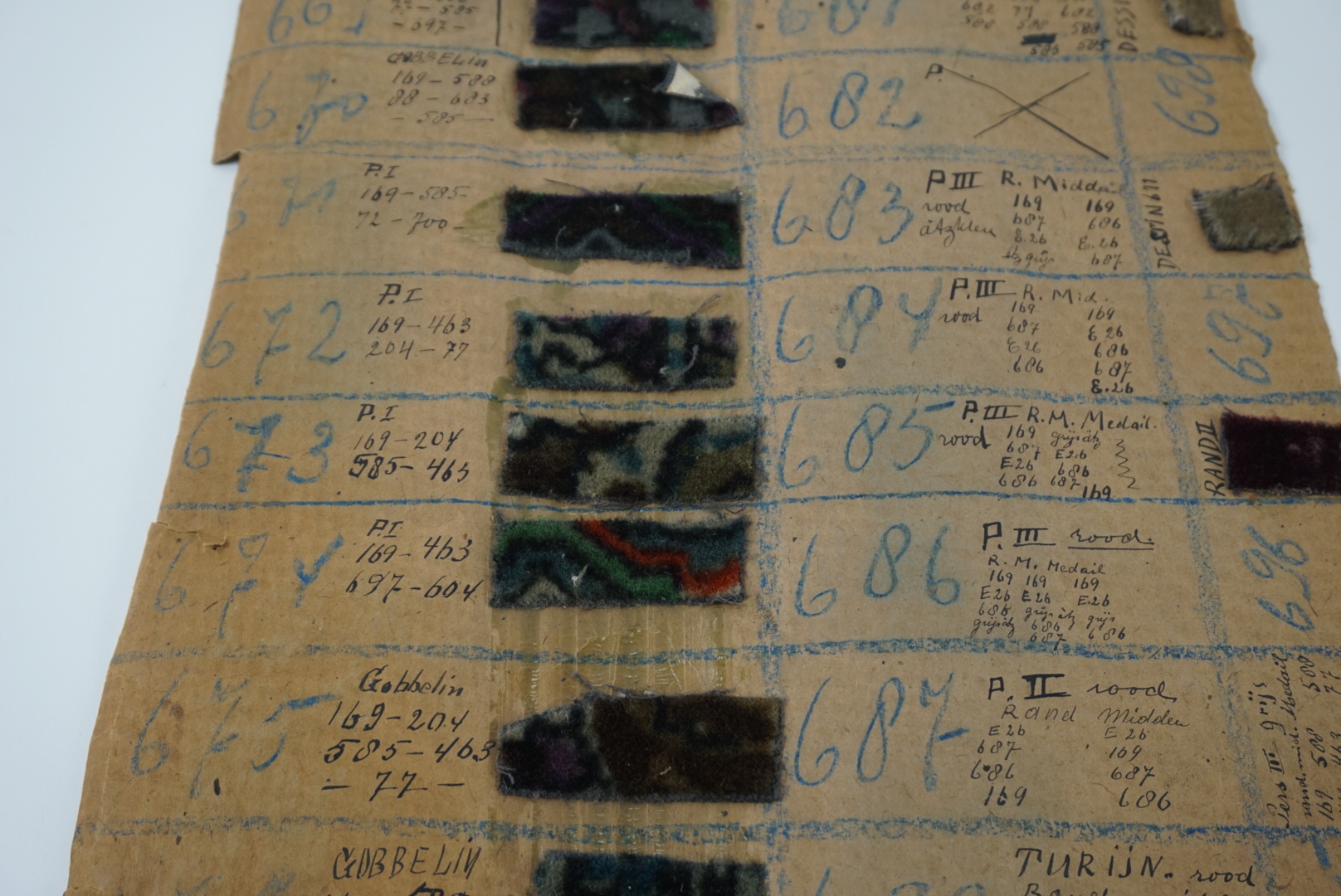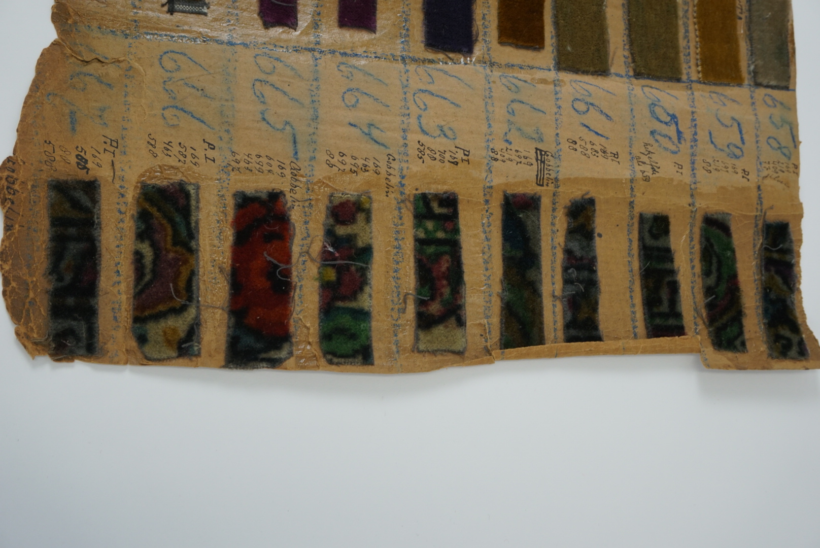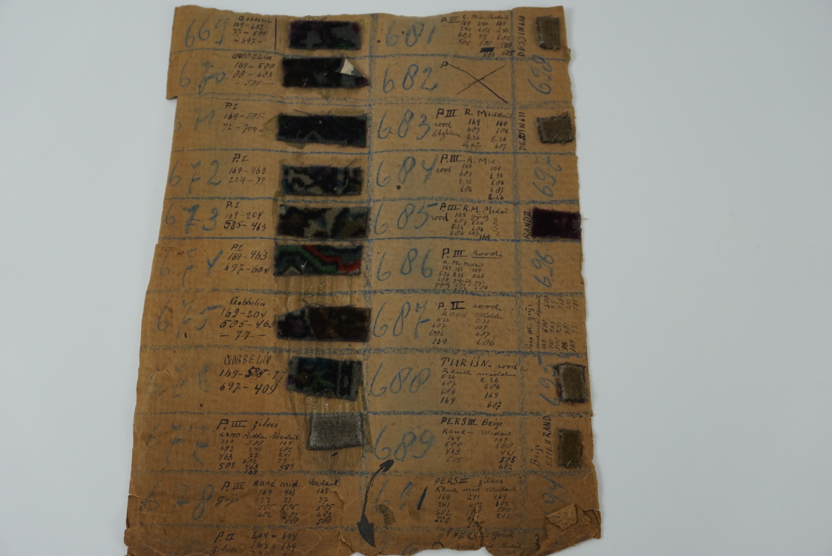 Fabrieksstalenboek met annotaties, materiaal: karton en velours, kleur: divers, lengte 45 cm, breedte 33 cm, in feite betreft het losse kartonvellen met opgeplakte monsters van velours stoffen, te weten: 647 Praag, 648 Sorento, 649 Dublin, 650 Dublin, 651 Perz II, 652 Praag, 653 turijn, 654 Pers III, 655 Pers III, 656 Turijn, 658 PI zilver ...