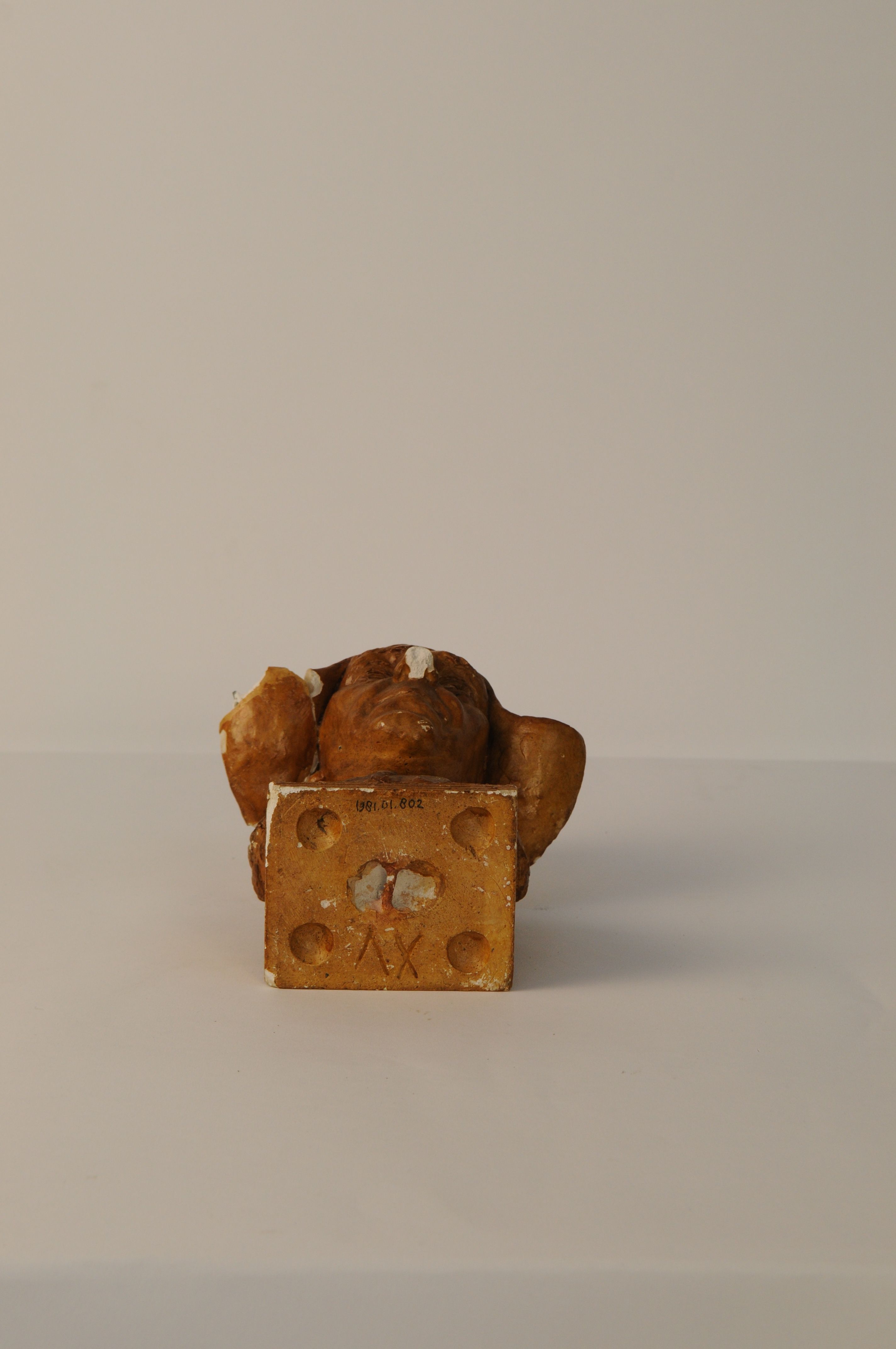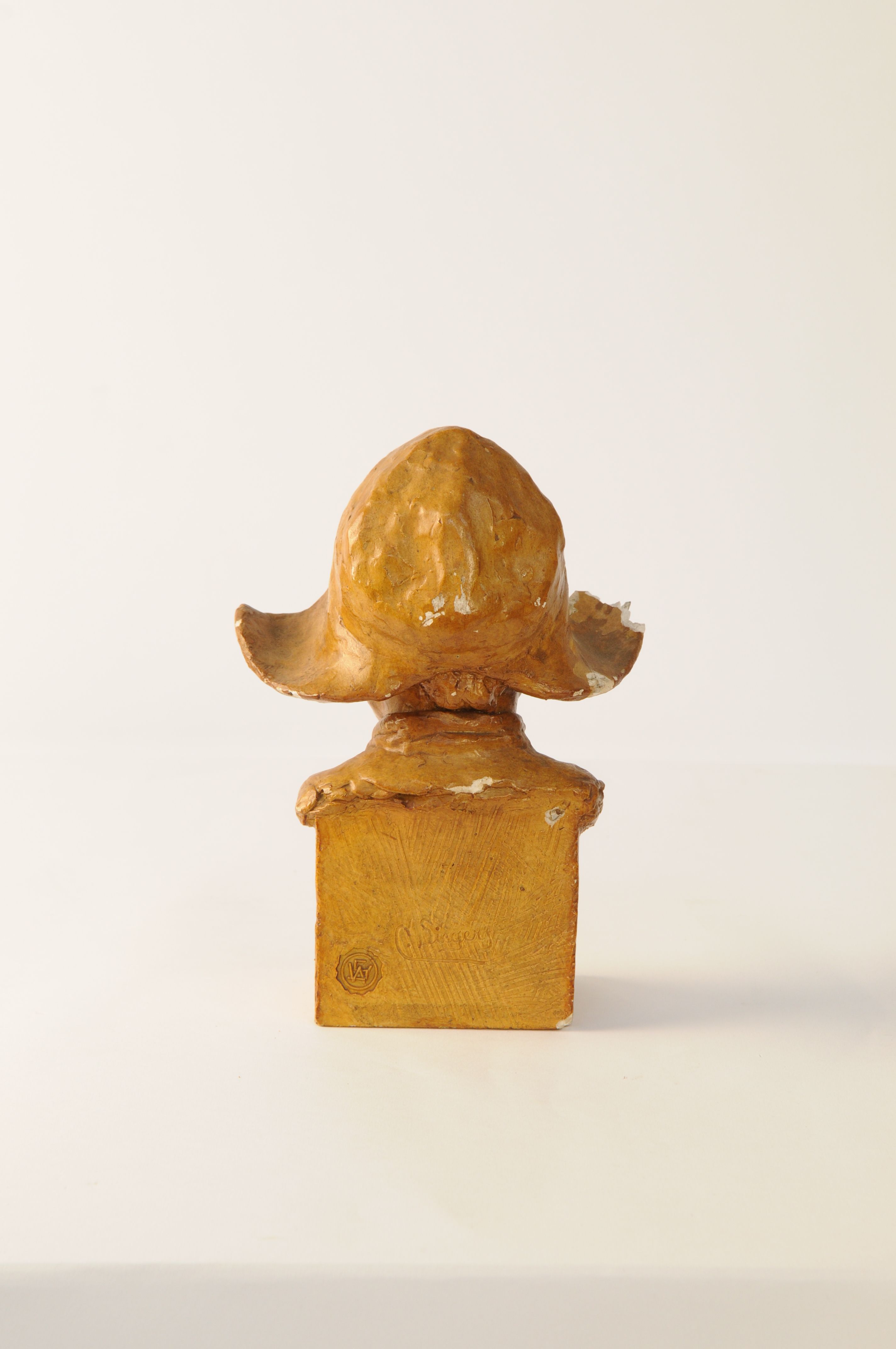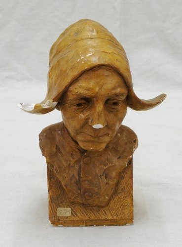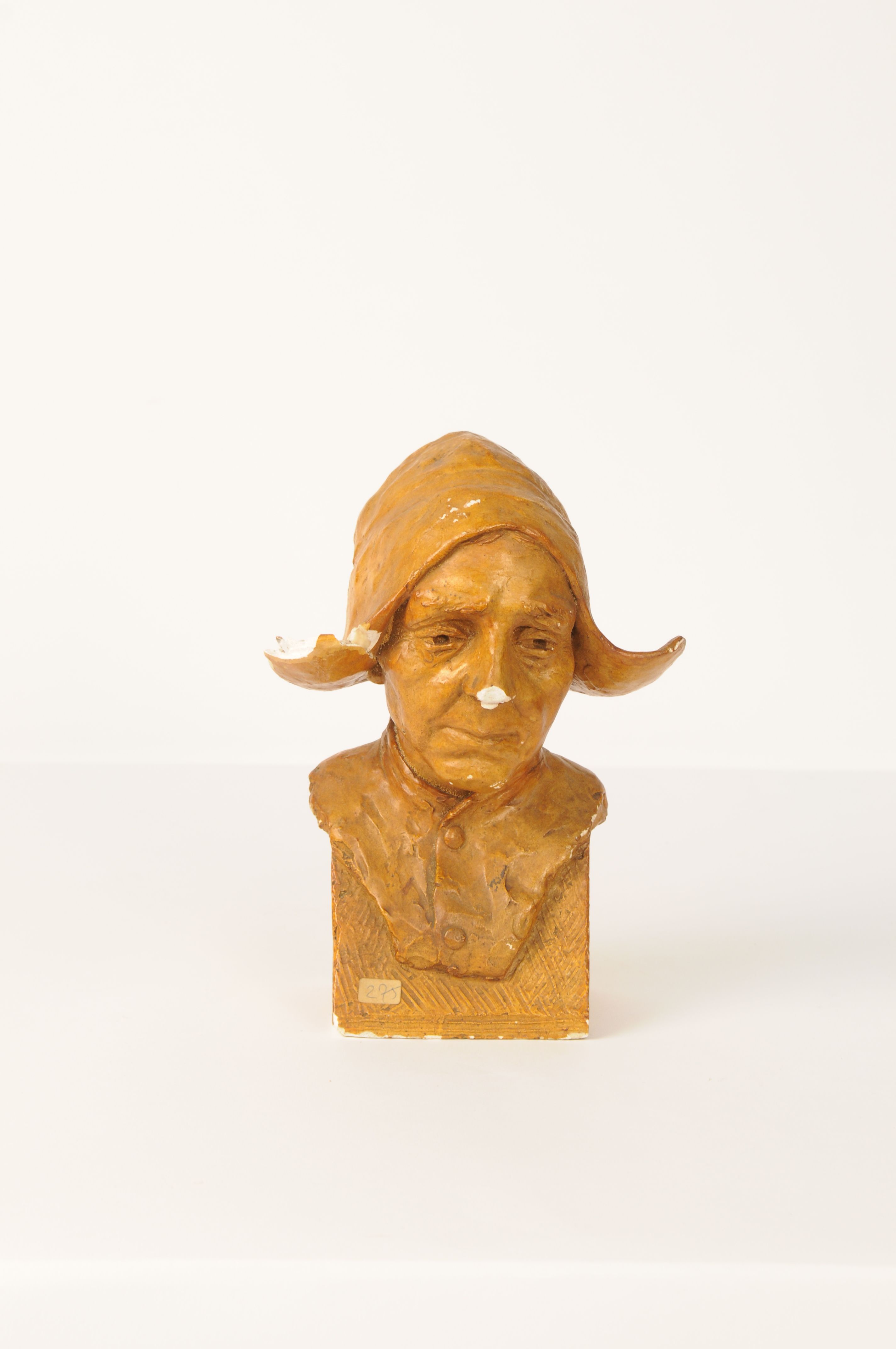 Gipsen vrouwenhoofd van een vissersvrouw, bruin-beige gekleurd. Werkmuts op het hoofd. Gesigneerd op achterzijde: C. Siegers. Voorts rond merkteken met ineen de initialen AWS (A.W. Siegers ?). Aan onderzijde ingekrast XV. Na breuk gelijmd aan muts. Beschadigd aan neus en muts. oud inv.nr 275