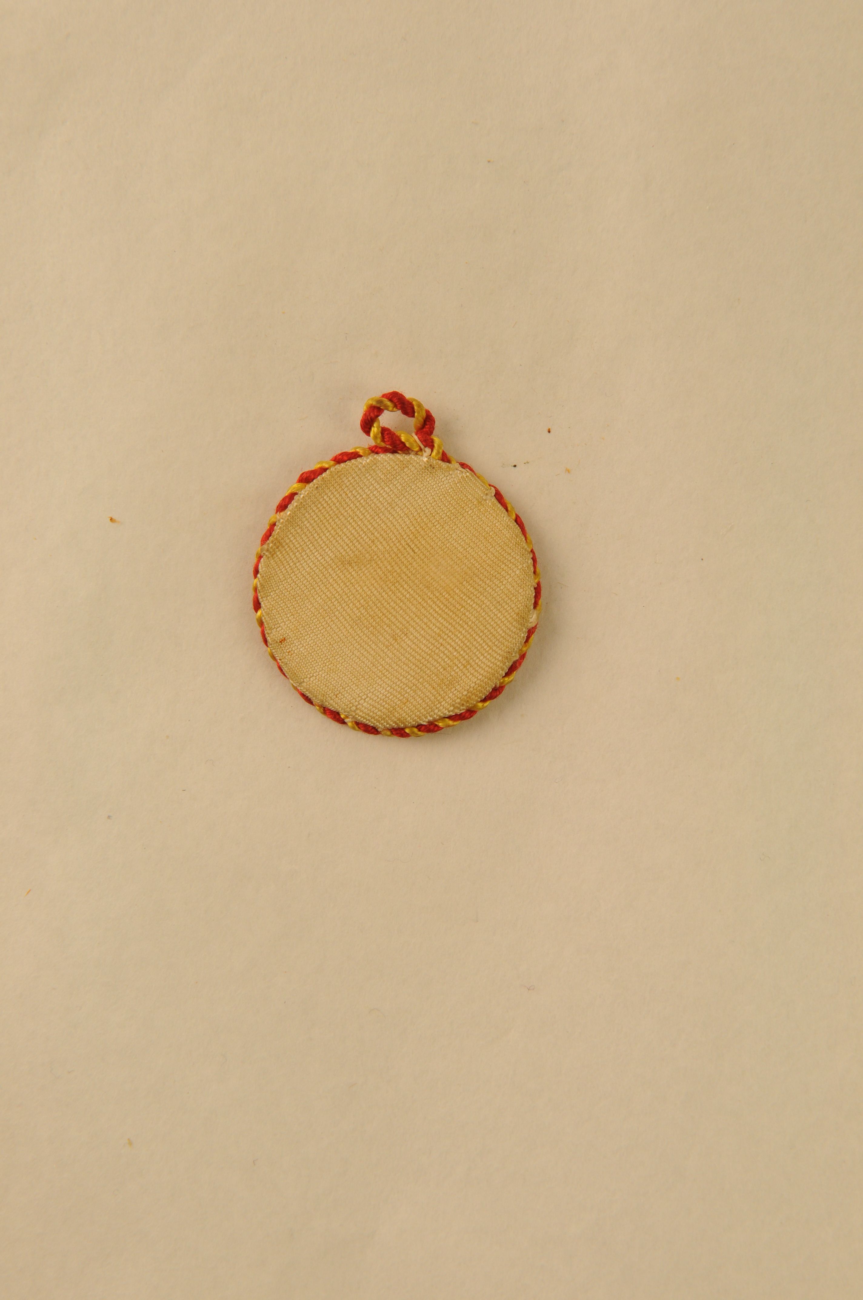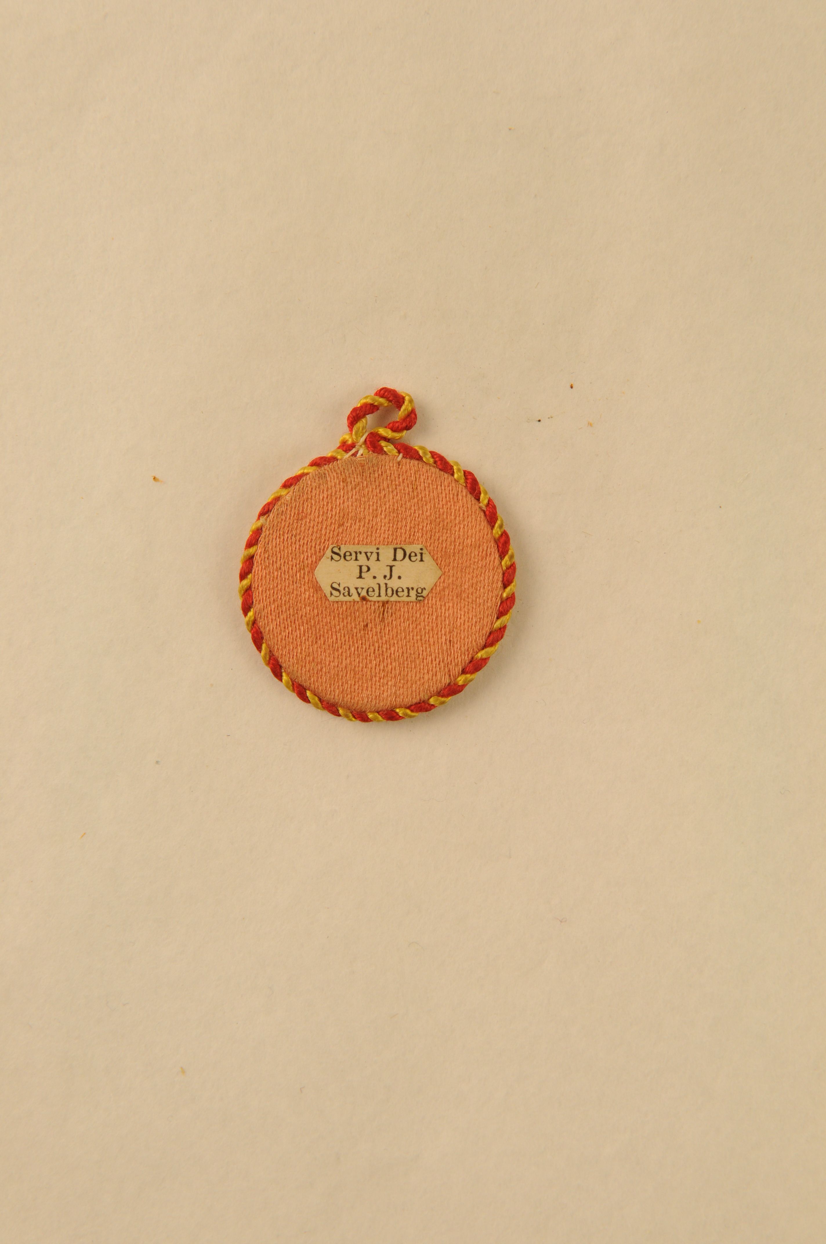 Stoffen Agnus Dei, ronde scapulier, karton, zijde en katoen met op vz. rose zijde met opgeplakt papiertje ‘Servi Dei P.J. Savelberg’, kz. witte stof, met ophanglusje, 3,5 x 3 cm.