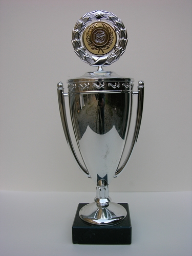 Prijsbeker voetbalvereniging RKSV, met losse deksel, bekroond met medaillon met voetbal-imprint en tekst: “RKSV Boxtel”, omgeven door een lauwerkrans. De beker heeft twee grepen en de standvoet rust op een zwart marmerstenen blok. Opm: tekstschildje voorzijde is verwijderd Prijsbeker voetbalvereniging RKSV, met losse deksel, bekroond met medaillon met voetbal-imprint en tekst: “RKSV Boxtel”, omgeven door een ...