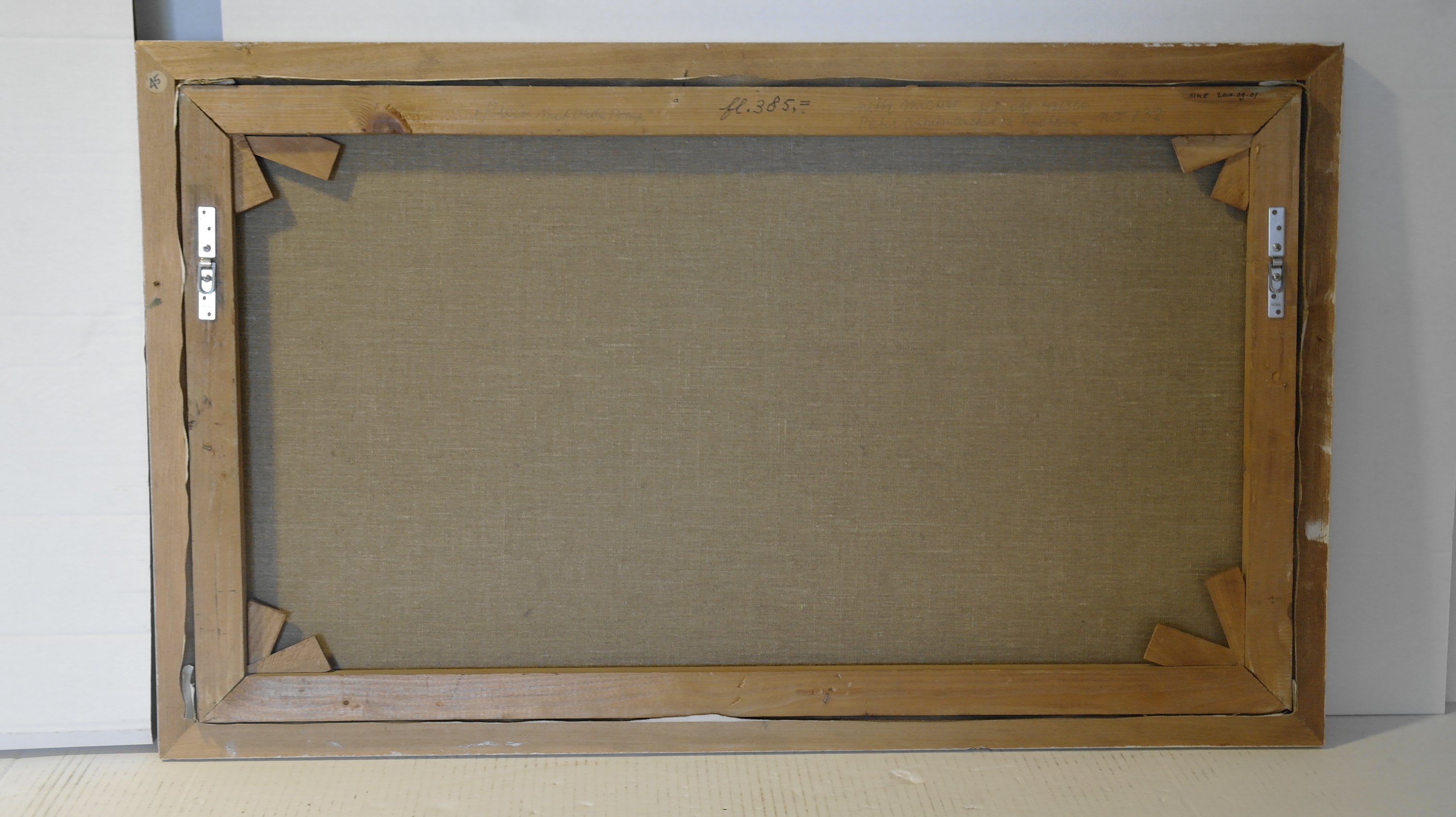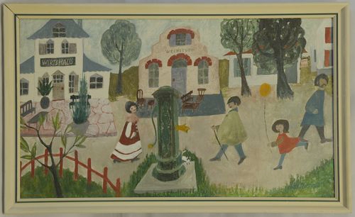 Plein met oude pomp – 1971, acrylverf/doek, 40 x 70 cm, gesigneerd en gedateerd r.o.: Netty Michels ’71, geannoteerd op a.z. spieraam: plein met oude pomp / fl 385,- / Netty Michels / Pieter Appelmanstraat 12 / Eindhoven / tel 040-431360 / No 132