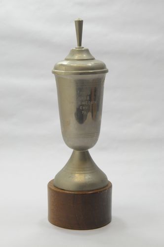 Prijsbeker met deksel – 1957, materiaal: verchroomd metaal en hout (standvoet), afmetingen: 17,5 x 7,1 cm, met de inscriptie: ‘DUAL MEET / O.B.C. – DIONYSIUS / 14-4-‘57’
