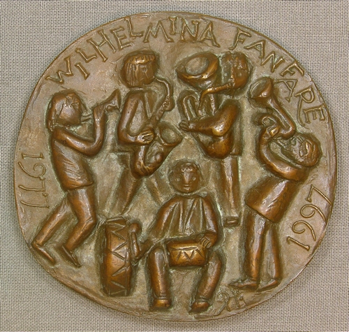 Penning Fanfare Wilhelmina 1977-1997 - 1997, brons, diam. 80 mm, dikte 12 mm, gesigneerd r.o.: ´f-sleutel H´ Van deze penning is de keramiek versie reeds geschonken, zie inv.nr 1997.06.30, van deze penning zijn twee bronzen en vijf-en-twintig keramische exemplaren vervaardigd