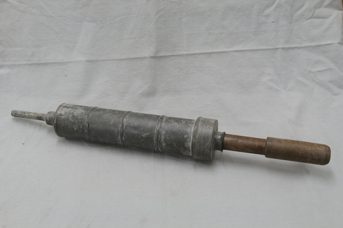 Veterinaire klisteerspuit met recht uiteinde, tin, 71 x 8,5 cm, cylindervormige bus van tin met schroefdraad afsluitelement waarin houten druk-handvat bestaande uit drie losse delen die middels een schroefdraad aan elkaar werden bevestigd