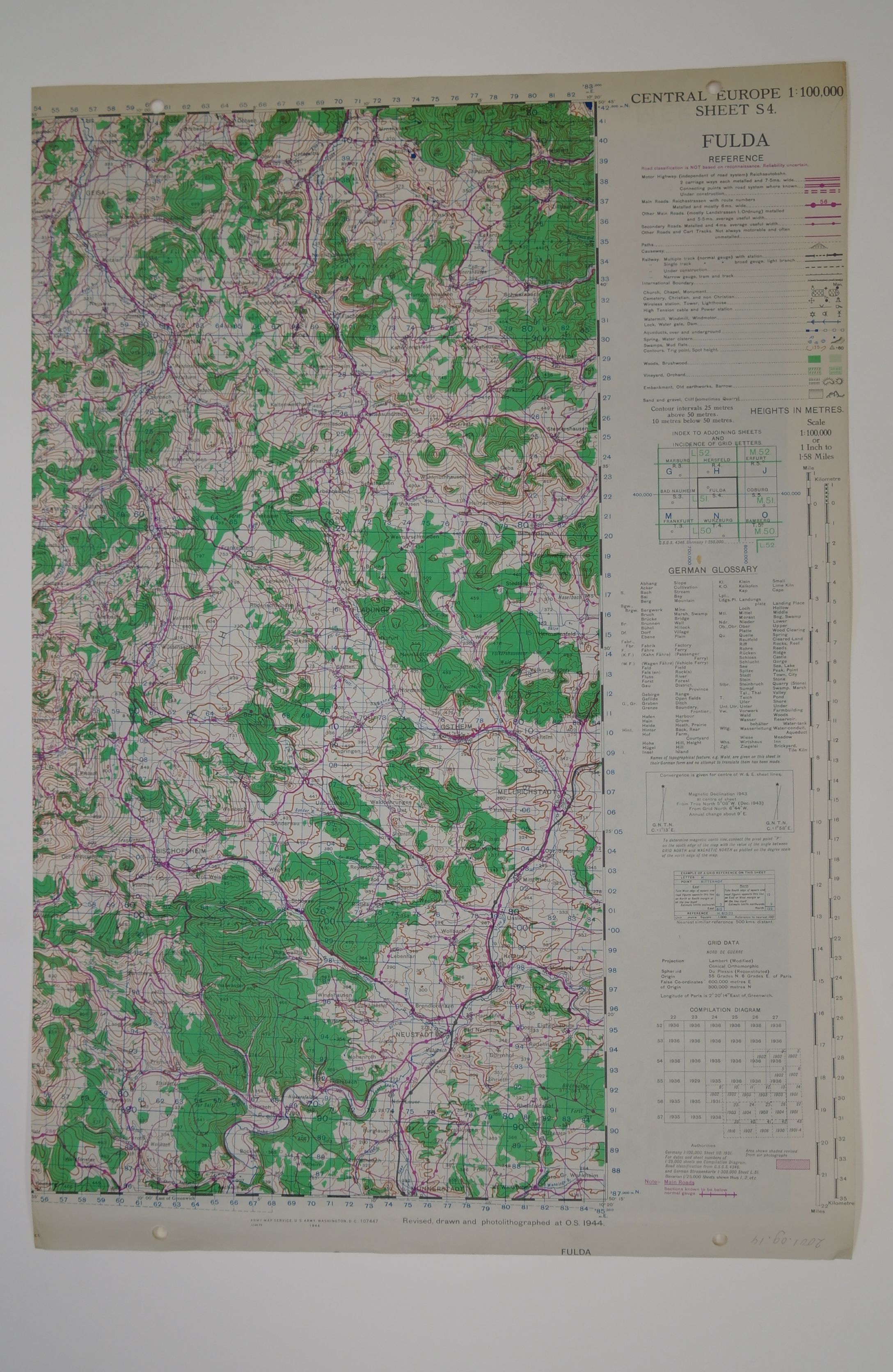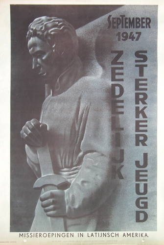 affiche met afbeelding van een stenen beeld van jongeling met zwaard en de tekst: september 1947 zedelijk sterker jeugd, missieroepingen in Latijnsch Amerika. wegens papierschaarste kort na de oorlog gedrukt op de blanco achterkant van reeds bedrukte vellen.