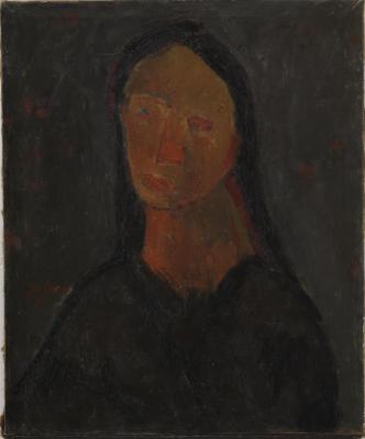 Portret (3/4 frontaal n.l.) van een vrouw met lang zwart haar en een zwarte jurk