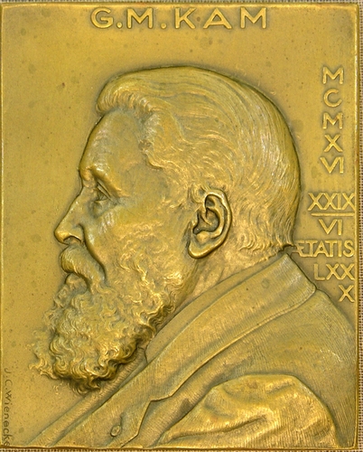Beeldzijde: portret en profil n.l. van G.M. Kam (Oud-Alblas1836-1922 Nijmegen). Opschrift: 'G.M. KAM MCMXVI XXIX/VI AETATIS LXXX' Opschrift Taal: Latijn Opschrift Positie: beeldzijde Opschrift Type: reliëfopschrift Opschrift Type: signatuur Opschrift Inhoud: "G.M. KAM MCMXVI XXIX/VI AETATIS LXXX" Opschrift Inhoud: J.C. Wienecke Opschrift Vertaling: G.M. Kam 29-06-1916 (op de) leeftijd van) 80 (jaar) Productie reden: De tachtigste verjaardag van de Nijmeegse amateur-archeoloog, maecenas en ...
