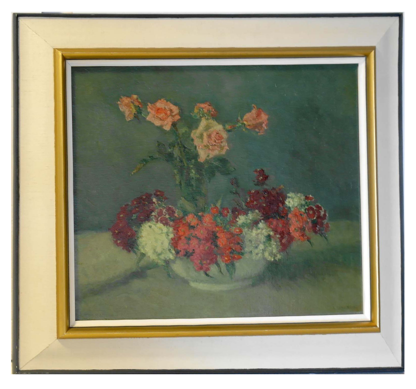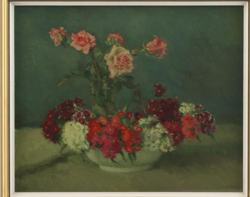 Schaal met bloemen en vaasje rozen - z.j., olieverf/doek, 45 x 55 cm, gesigneerd r.o. én l.o.: K TIMMERING gesigneerd r.o. én l.o.: K TIMMERING géén nummer gemeentelijke sociale dienst of gemeentelijke aankoop, wél op a.z. nr 16 a.z. sticker: eigendom Gem. Inst. v. Maatsch. Steun gerestaureerd bij Tiendschuur Tilburg
