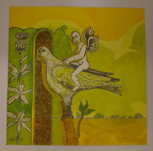 Zonder titel (Landschap met op voorgrond zilverdistel en tak met daarop een duif die door een engeltje bereden wordt) - 1993, gemengde techniek/papier, 50 x 50 cm, gesigneerd en gedateerd l.o.: león ‘93