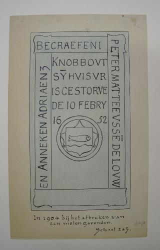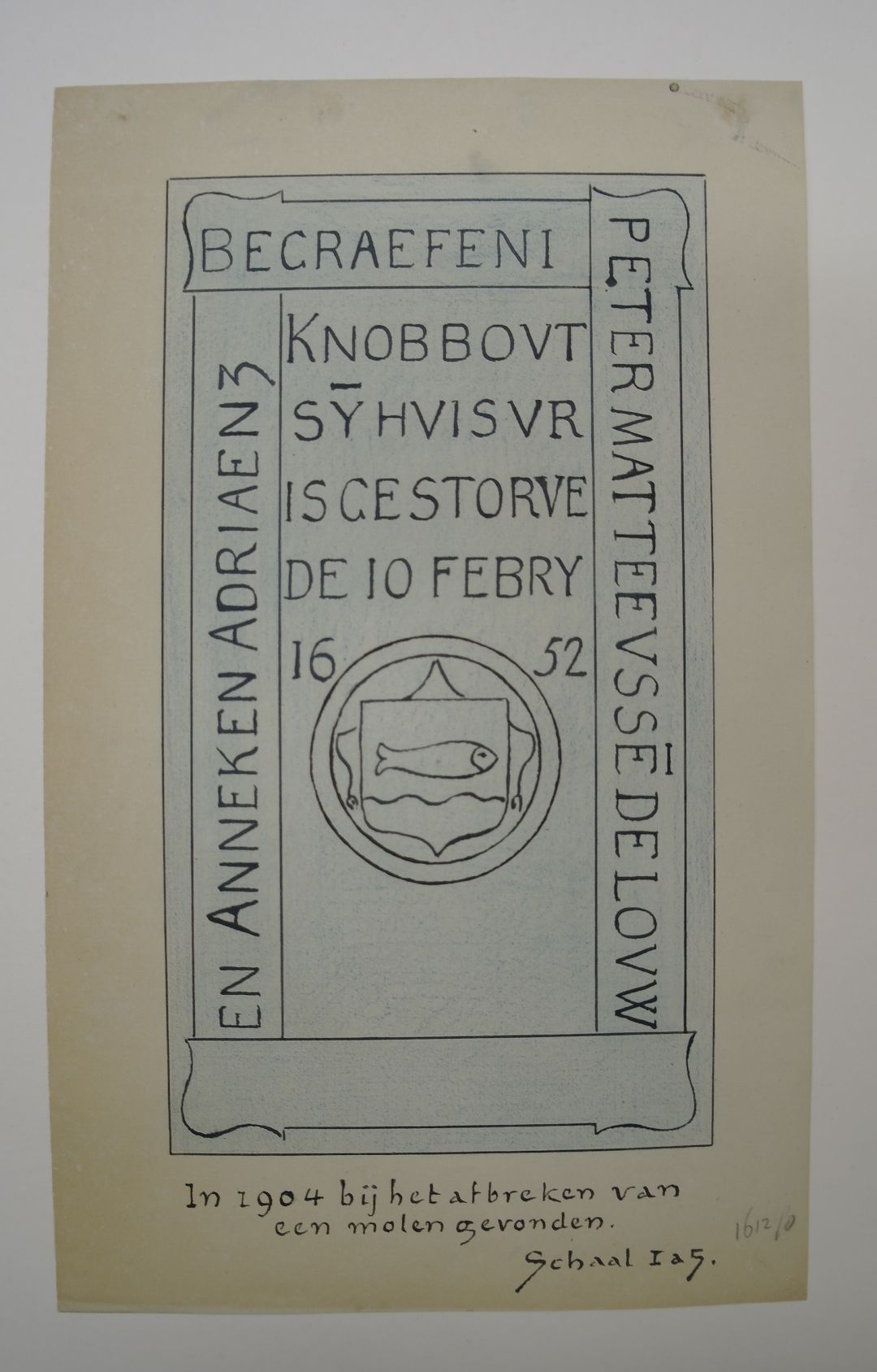 geannoteerd onder voorstelling in inkt: in 1904 bij het afbreken van een molen gevonden schaal I a 5. genummerd in potlood r.o.: 1612/0