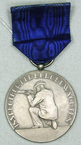 Prijspenning Gewestelijke Schietwedstrijd Burgerwachten - 1934, materiaal: metaal, verzilverd, afmetingen: 6,6 x 4,6 x 0,2 cm, vz.: reliëfafbeelding van gehurkte mannelijke schutter met hoed op het hoofd, omlopende tekst in marge: 'INSPECTEUR DER BURGERWACHTEN', kz. inscriptie 'Noord-Brabant 2e prijs C XI' en omlopende lauwerkrans, met doorboord knopje en draagringetje, waaraan een linnen draagfragment met sluitspeld.