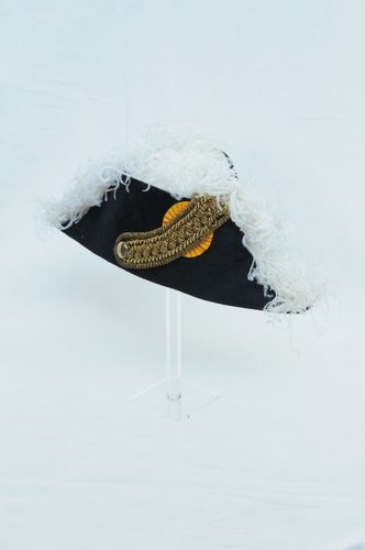 r.z. oranje cocqarde met daaroverheen goudgalon, o.z. vastgezet met koperen knoop, in voering staat Empire steek over de gehele lengte bovenop versierd met witte struisvogelveren hierbij hoort generaalspluim 1991.04.07 b