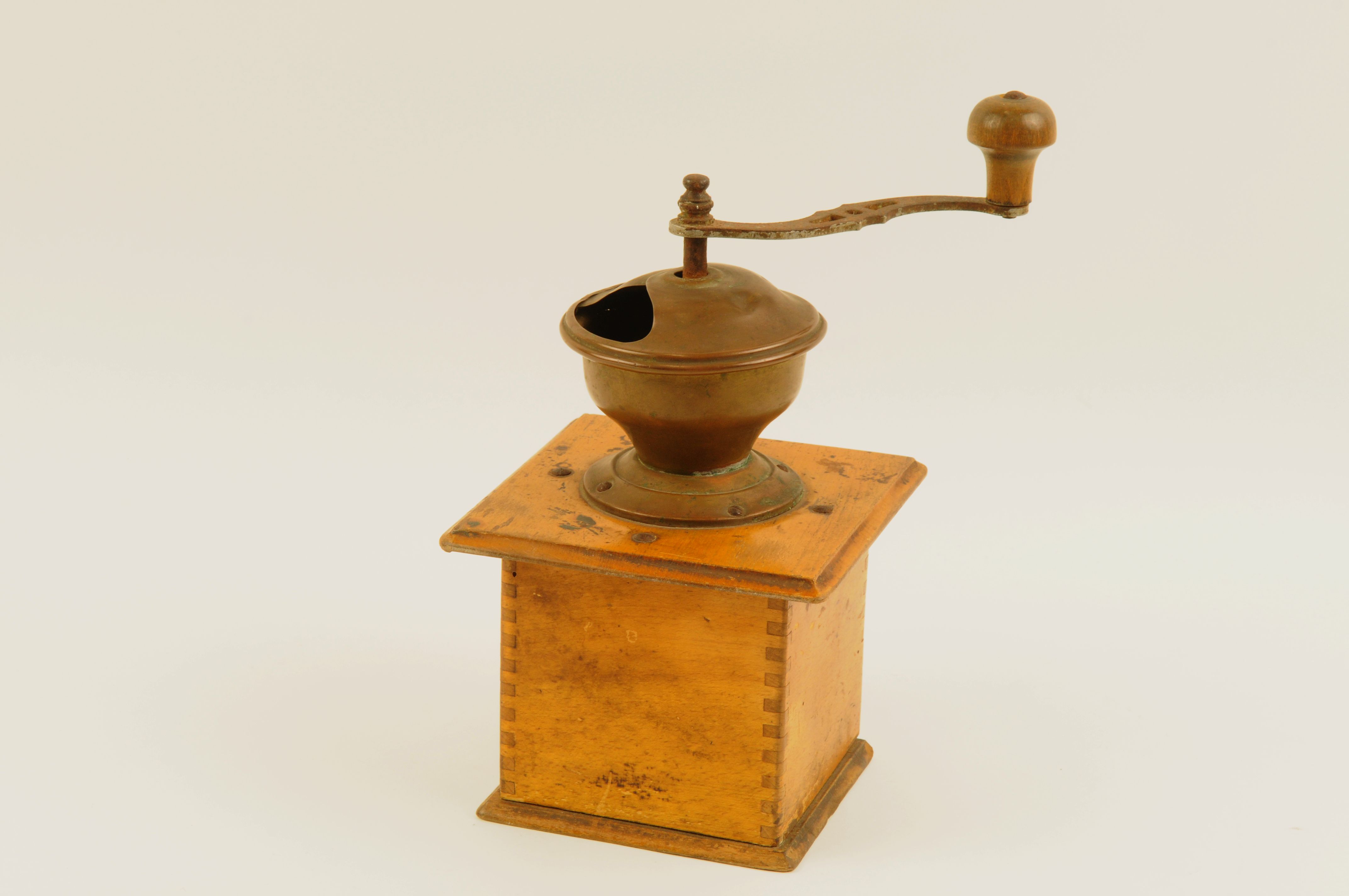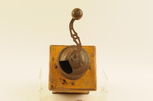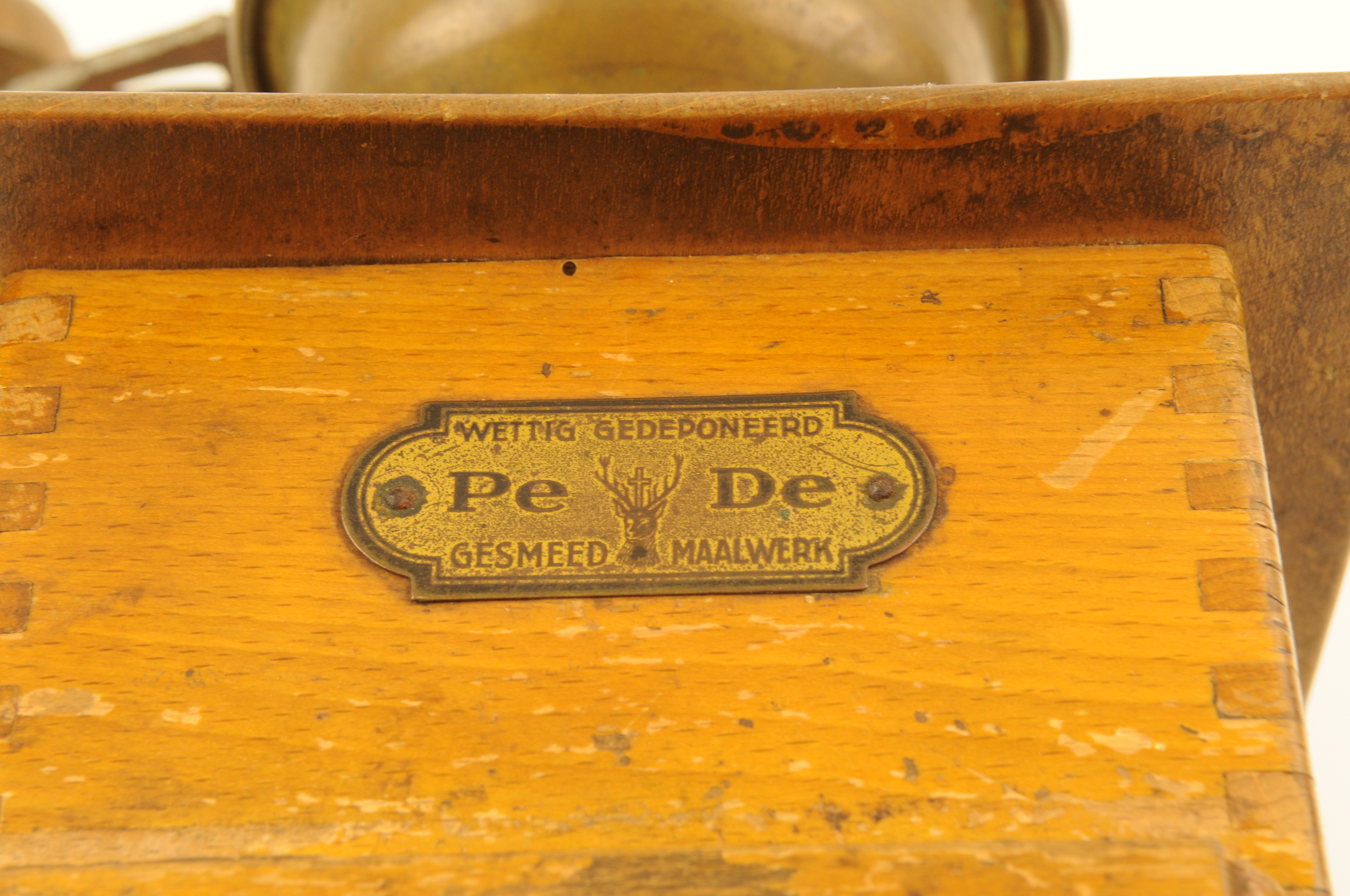 Hand-koffiemolen met metalen plaatje: 'Wettig gedeponeerd PE DE gesmeed maalwerk'