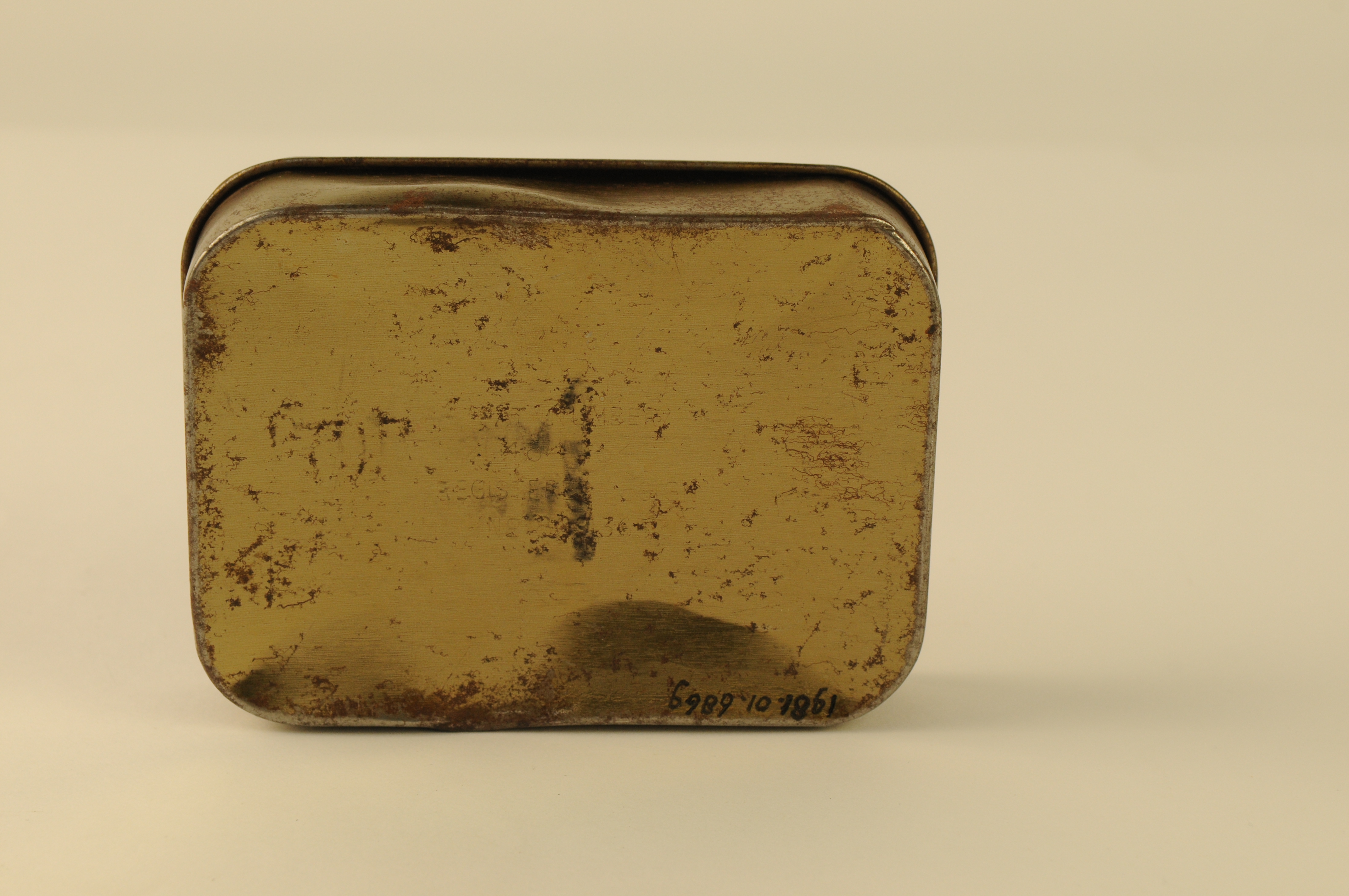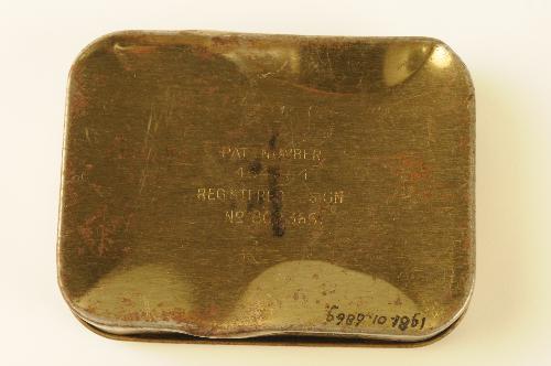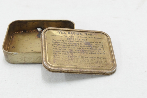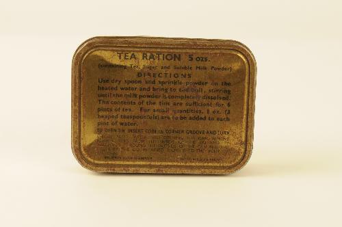 Blikje met scharnierend dekseltje waarop opschrift: 'TEA RATION 5 OZ S containing tea, sugar and soluble milk powder'. op onderzijde opschrift: 'Pat. number 464864 Registered desig no 809365