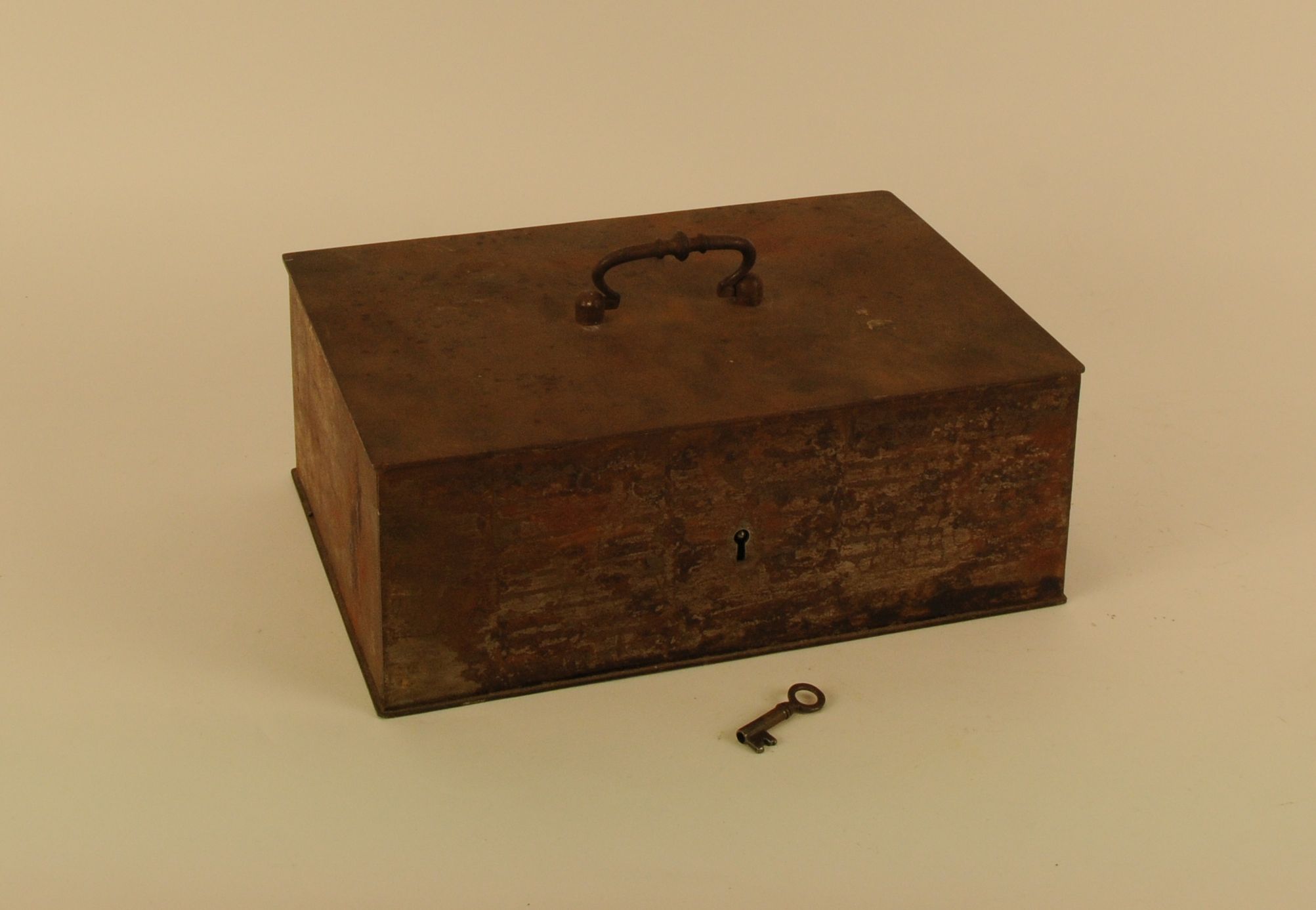 Rechthoekig ijzeren geldkistje met sleuteltje en scharnierend deksel met boveno0p een scharnierende handgreep