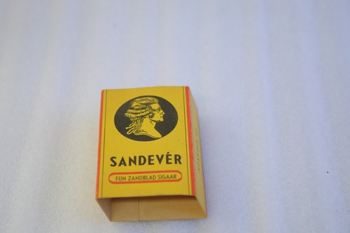 Sigarendoosje 'Sandéver Fijn Zandblad Sigaar' - 2e t/m 3e kwart van de 20e eeuw, materiaal: karton, afmetingen: 10 x 11,5 cm, sigarendoosje voor 10 Sandéver Fijn Zandblad sigaren, fabrikaat Vervoort & Zn, Best