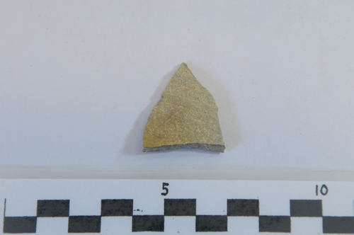 Eindhoven Ravensdonck 1985, Put VII, vondstnr. 5, uit coupe spoor 7. Scherfje Laatmiddeleeuws Siegburg steengoed.