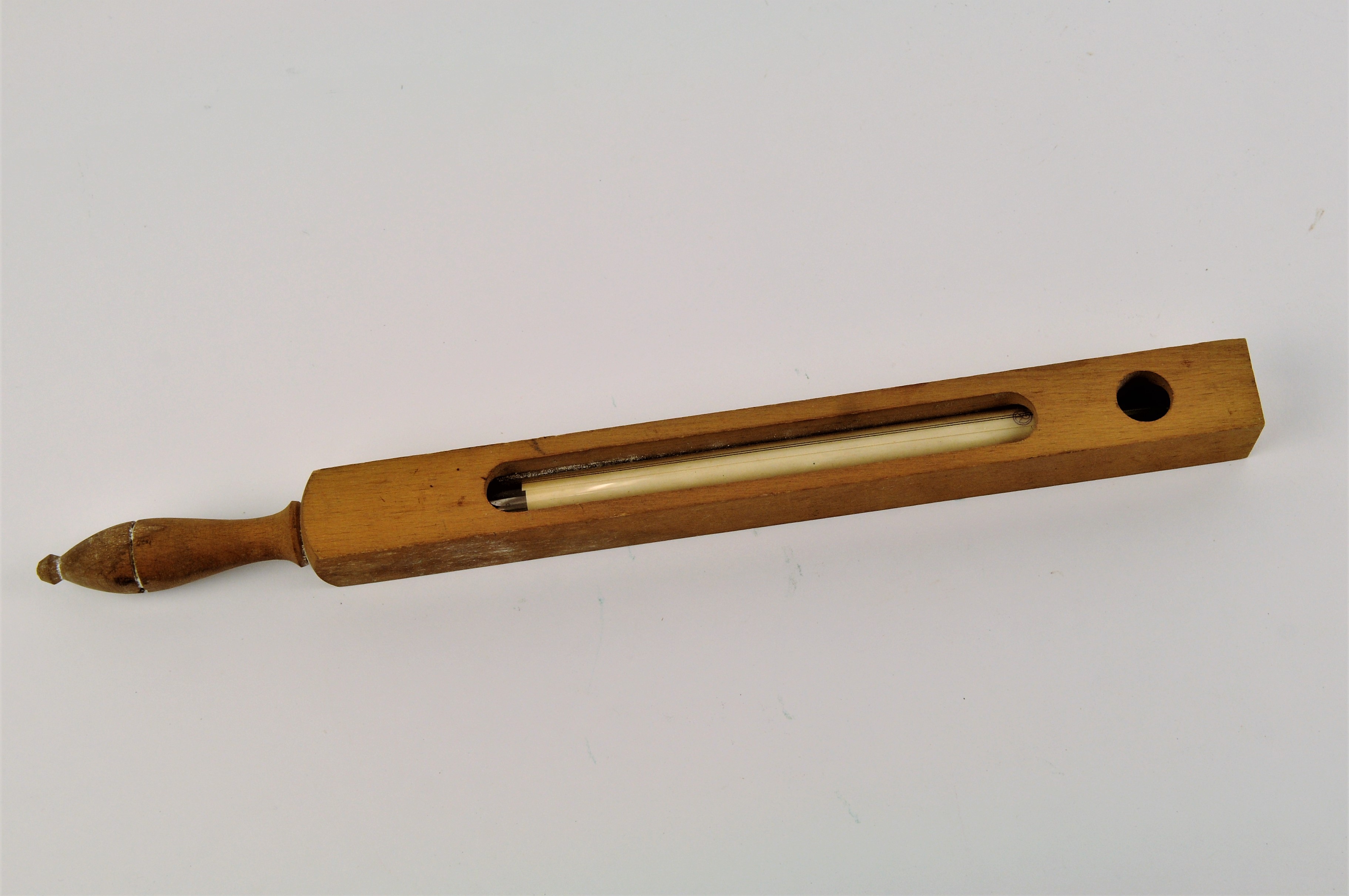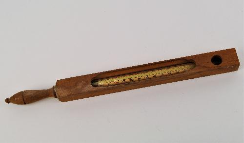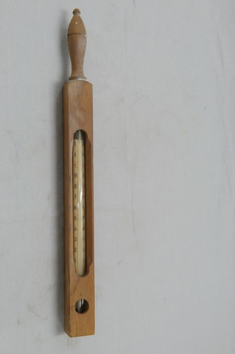 Thermometer in houten huls met temperatuurrange van 0 - 120 graden Celsius.