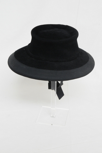 Dameshoed, materiaal: veloursvilt, kleur: zwart, afmetingen: 30 x 28 cm, met een kleine bol, afgezet met reepvilt, de rand van de hoed is versierd met doorgestikt ribslint, afgebiesd met ribslint, handgemaakt