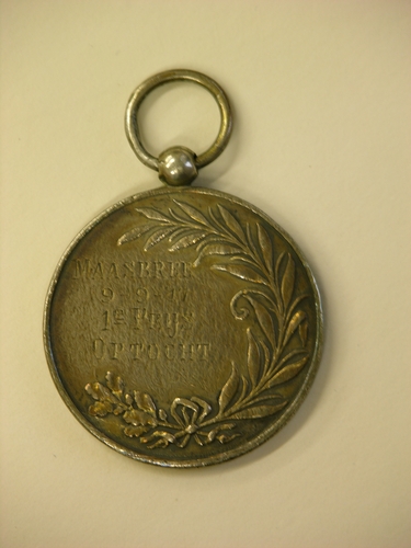 Ronde prijsmedaille/draagpenning. Recto: reliëfafbeelding sport/turn-attributen met leeg schildje, links en rechts een lauwertak (eiekenbald n laurierblad). Verso: inschrift 'Maasbree 9-9-'17 1e prijs optocht. Onder n rechts met elkaar verbonden lauwertakken (eikenblad en laurierblad). Met doorboord knopje/draagringetje.