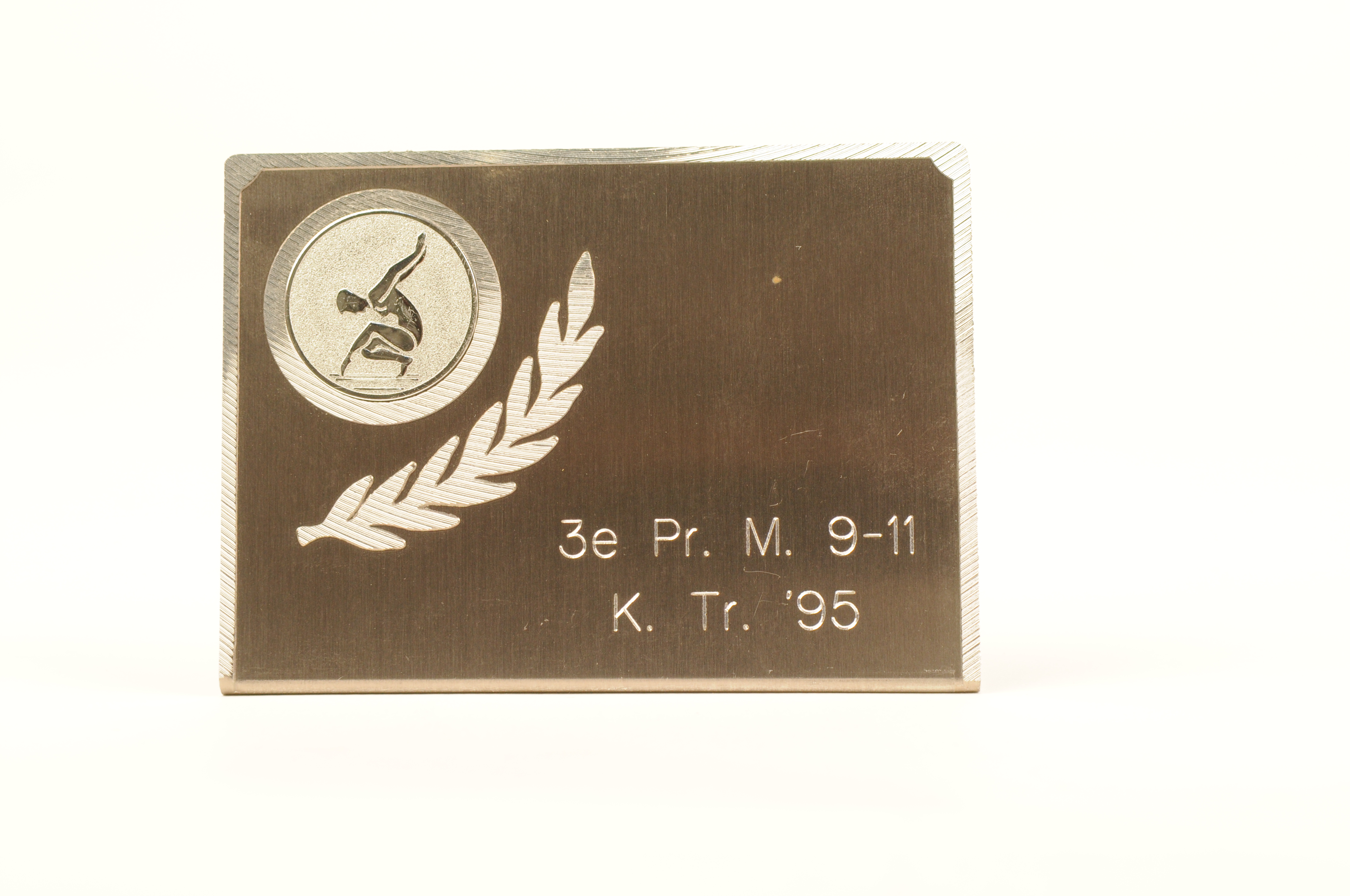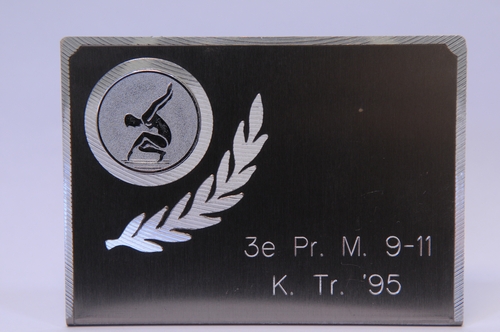 Turntrofee, aluminium prijskamp-standaardje met een rond embleem dat een figuur in een elegante tunbeweging toont met daaronder een lauwertak. Inschrift: 3e Pr. M. 9-11 K. Tr. '95. Adresplakkertje: Allers Hertogstraat 10 5611 PB Eindhoven
