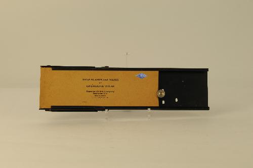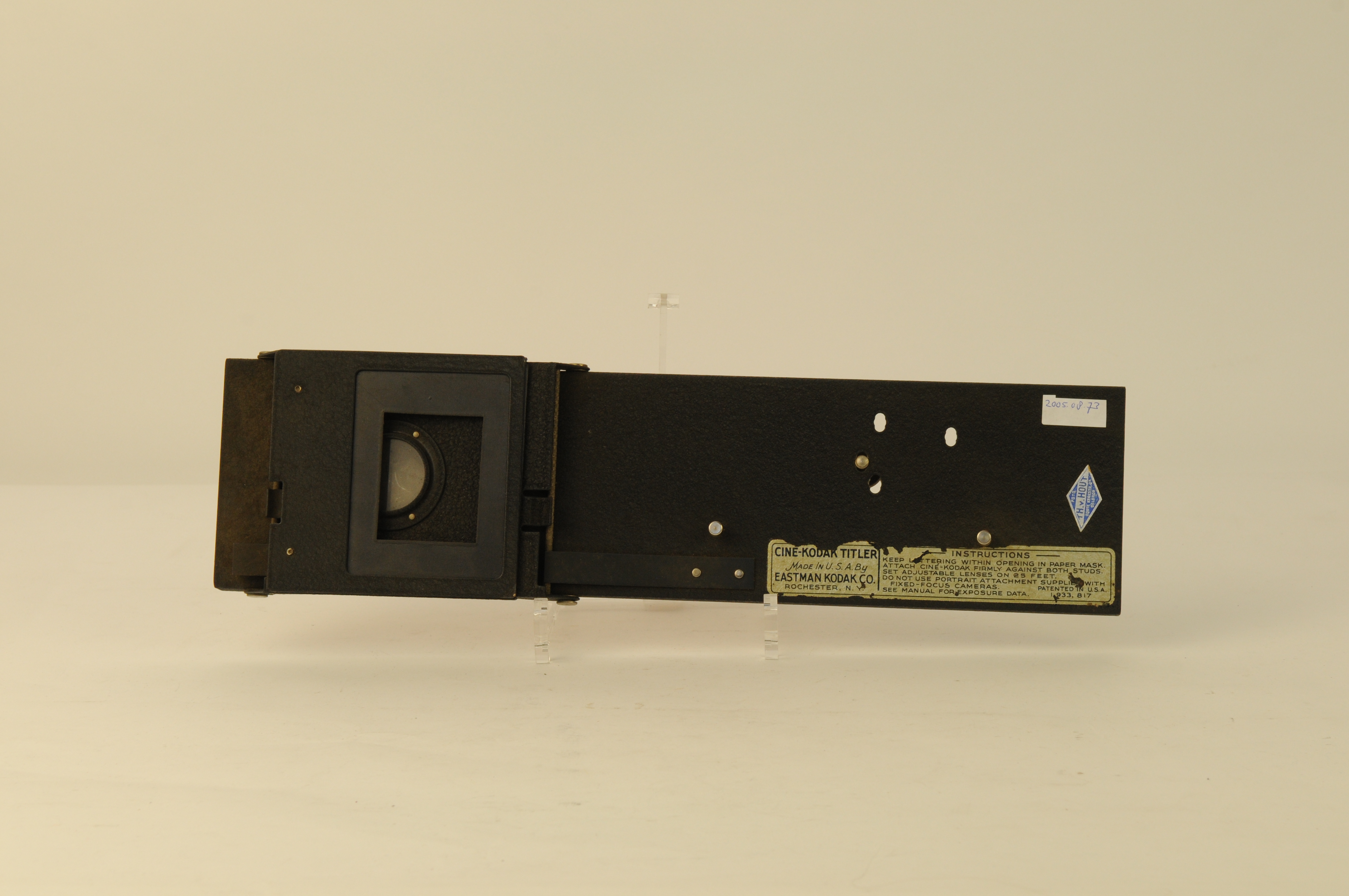 Doos met apparaat voor het nemen of afdrukken (?) van foto’s; gemerkt Cine-Kodak-Titler made in U.S.A by Eastman Kodak Co Rochester N.Y. Instructielabel met tekst: Patented in U.S.A. 1.933.817, metaal, glas, hout en bakeliet, met twee losse lampen en lampenhouder met twee fittingen, 15,5 x 70 x 27 cm