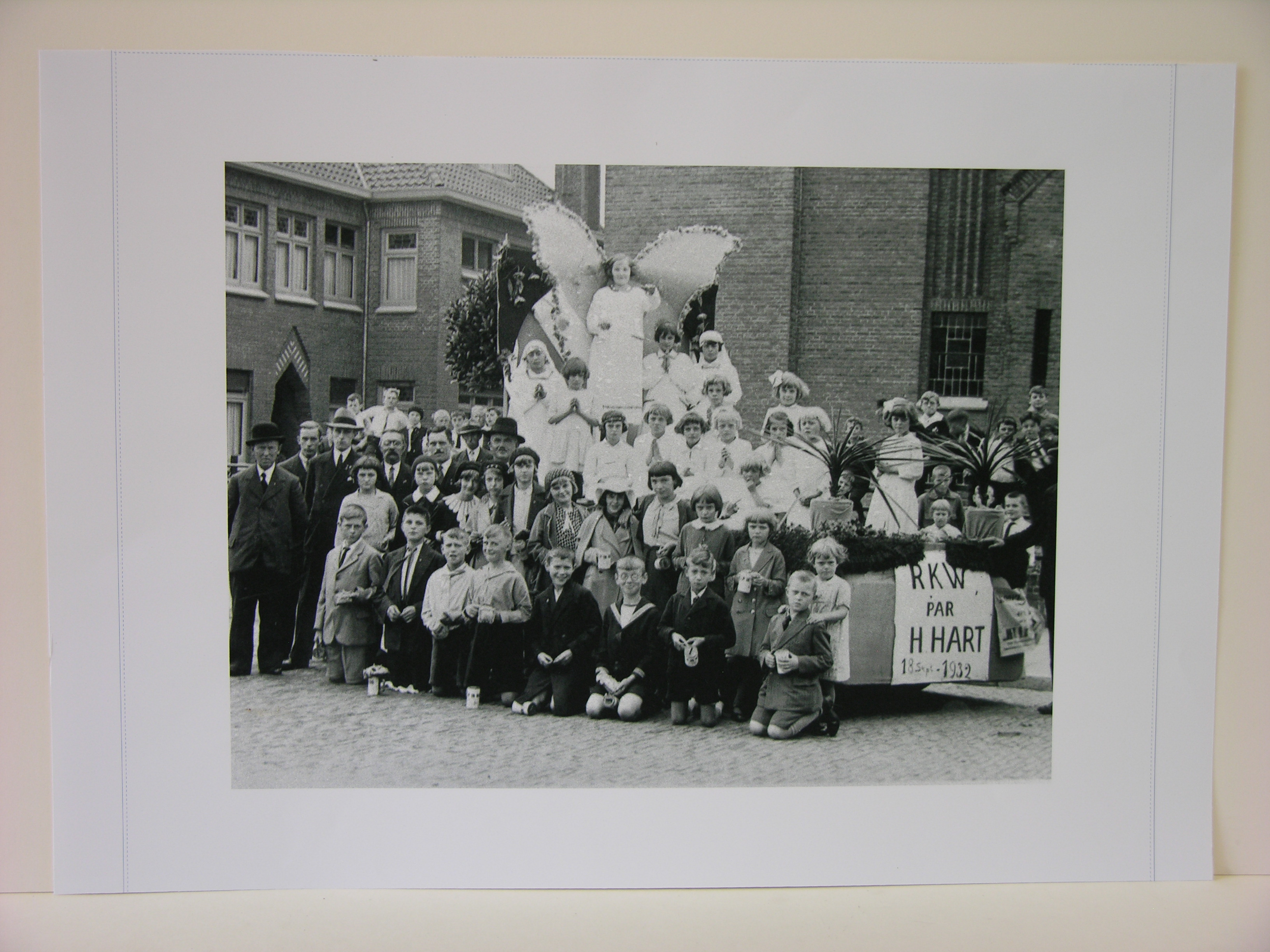 Praalwagen van de Heilig Hartparochie in de Gestelsestraat in Eindhoven-Gestel in 1932, zwartwit-print/papier, 300 x 400 mm., foto: coll.Regionaal Historisch Centrum Eindhoven Fotoprints bij expositie 'Geloven in Eindhoven', n.a.v. Open Monumentendag 2005, in passe-partout, telkens twee prints in 1 passe-partout