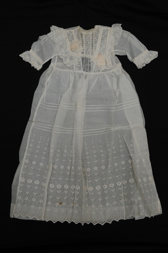 Doopjurkje - z.j., materiaal: katoen/organza, kleur: ecru, afmetingen: 73 x 63 cm, voorkant met pas doorlopend naar achter, afgezet met stroken kant Dit object is bij doopsel nog gedragen door de vader van de schenker: Jan (Johannes Antonius) van Otterdijk (*Maarheeze 25-06-1916 - + 01-11-1990 Eindhoven), gehuwd met Dorothea Maria den Ouden (*Zevenbergen 29-12-1923, gehuwd 24-01-1946) ...