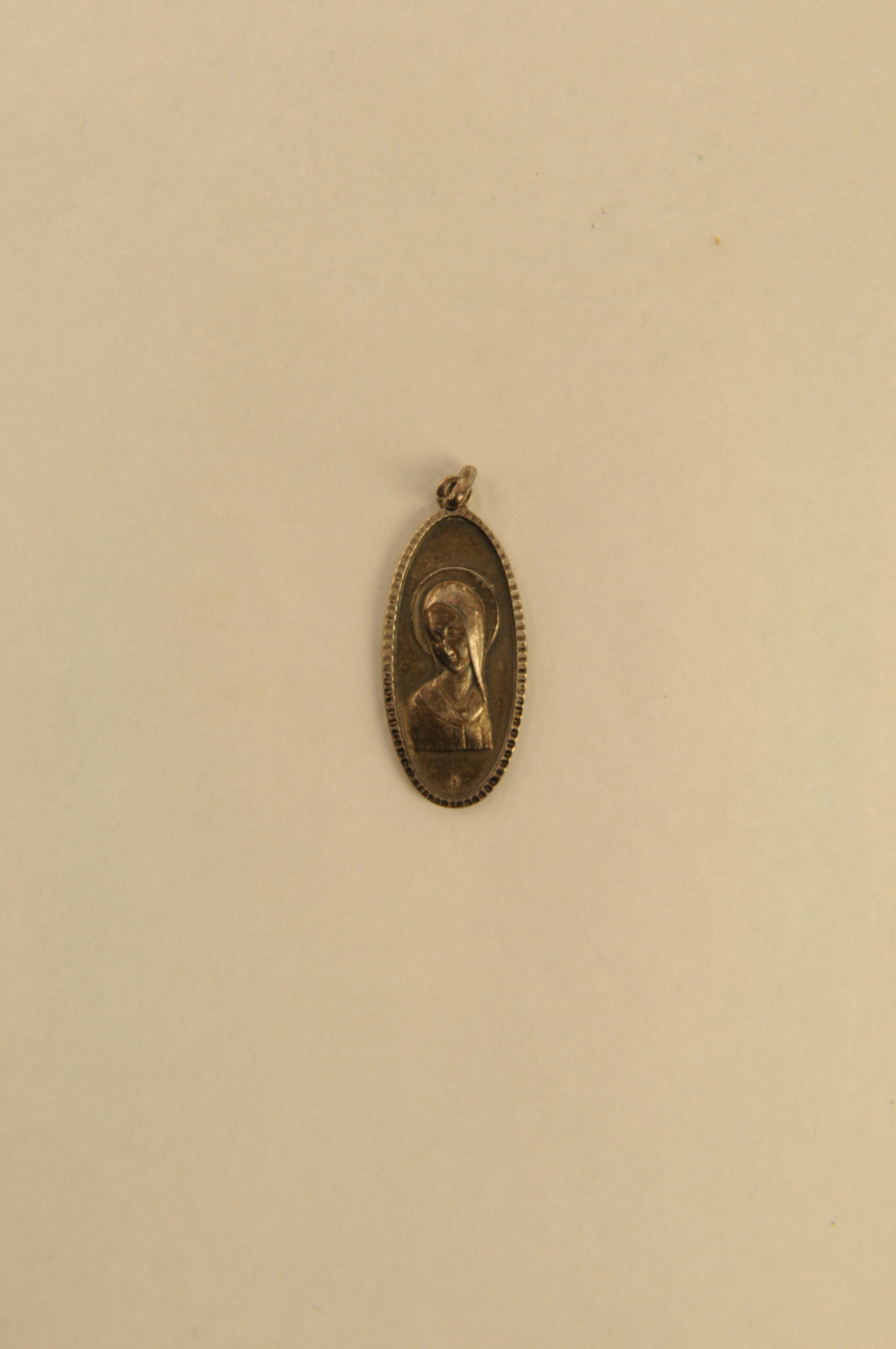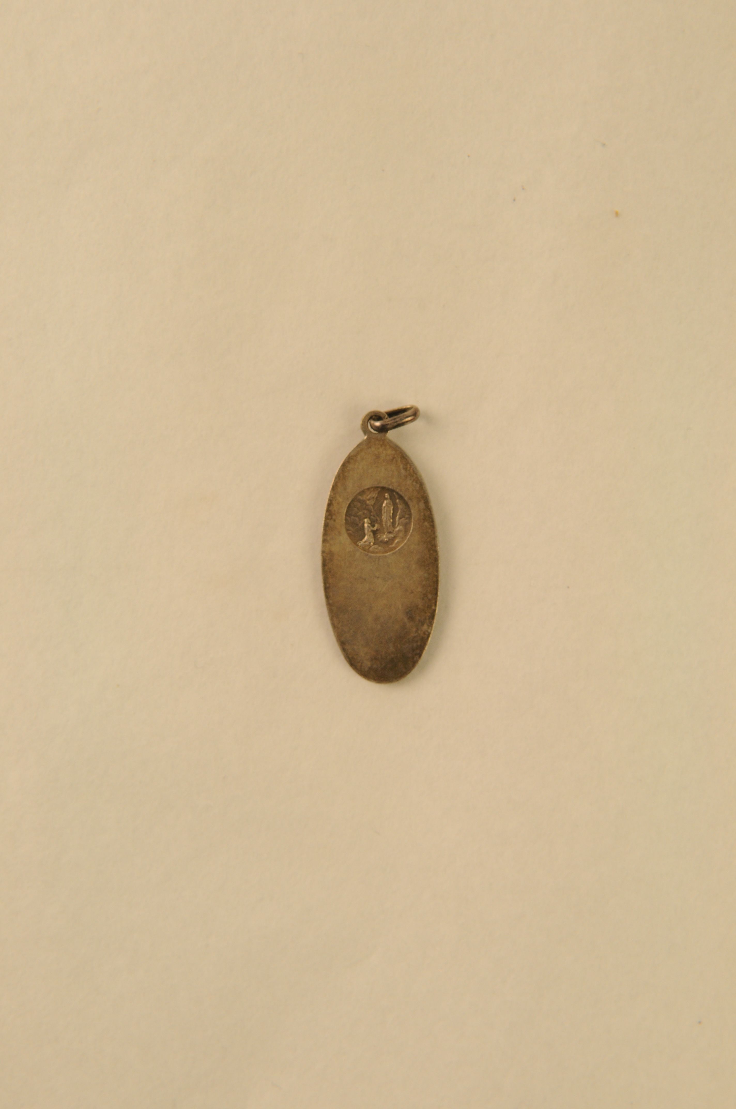 Religieuze medaille/draagpenning, materiaal: metaal/verzilverd, langgerekt ovalen penning met ophangoogje met aan vz. de portret van de Maagd Maria in ‘Art Deco’ stijl, kz. miniatuur afbeelding van de verschijning van Maria aan Bernadette Soubirou te Lourdes, 3,9 x 1,5 x 0,1 cm