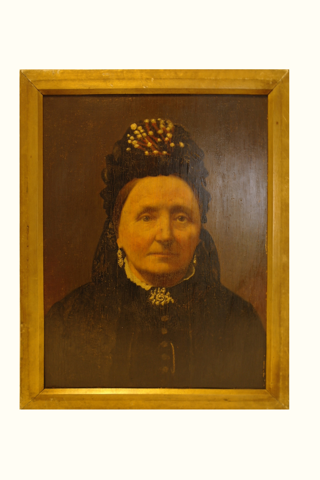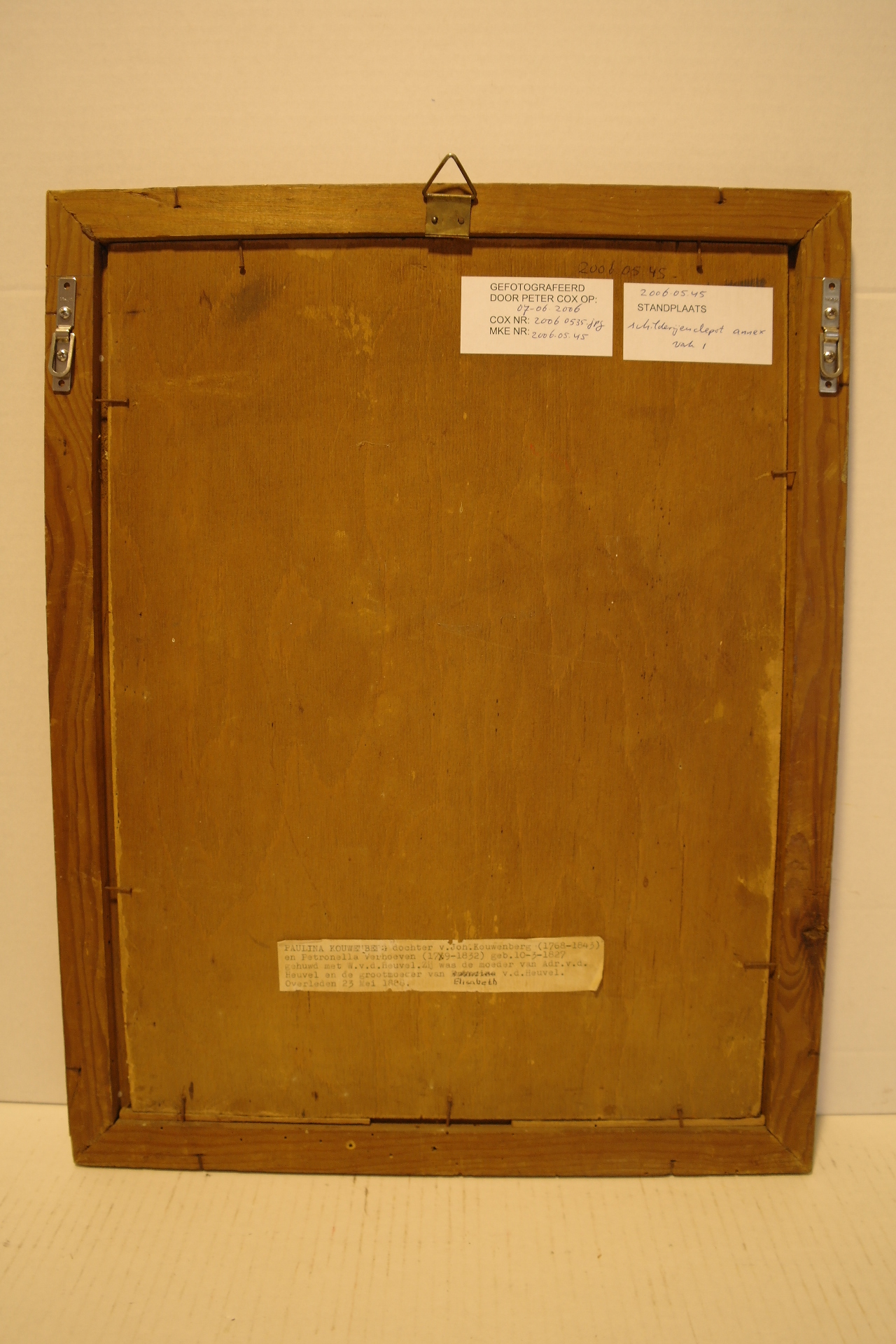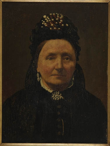 Vrouwenportret van Paulina Kouwenberg, dochter van Joh. Kouwenberg (1768 - 1843) en Petronella Verhoeven (17.9 - 1832), geboren o p 10-03-1827 en gehuwd met W. v.d. Heuvel. Zij was de moeder van Adr. v.d. Heuvel en de grootmoeder van Elisabeth v.d. Heuvel. Overleden 23 mei 1888, afmetingen 40 x 30 cm Opm: sticker op achterzijde