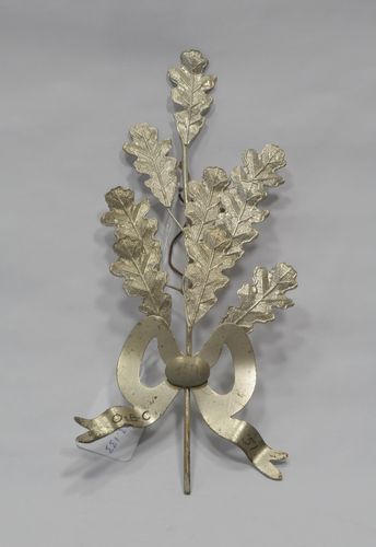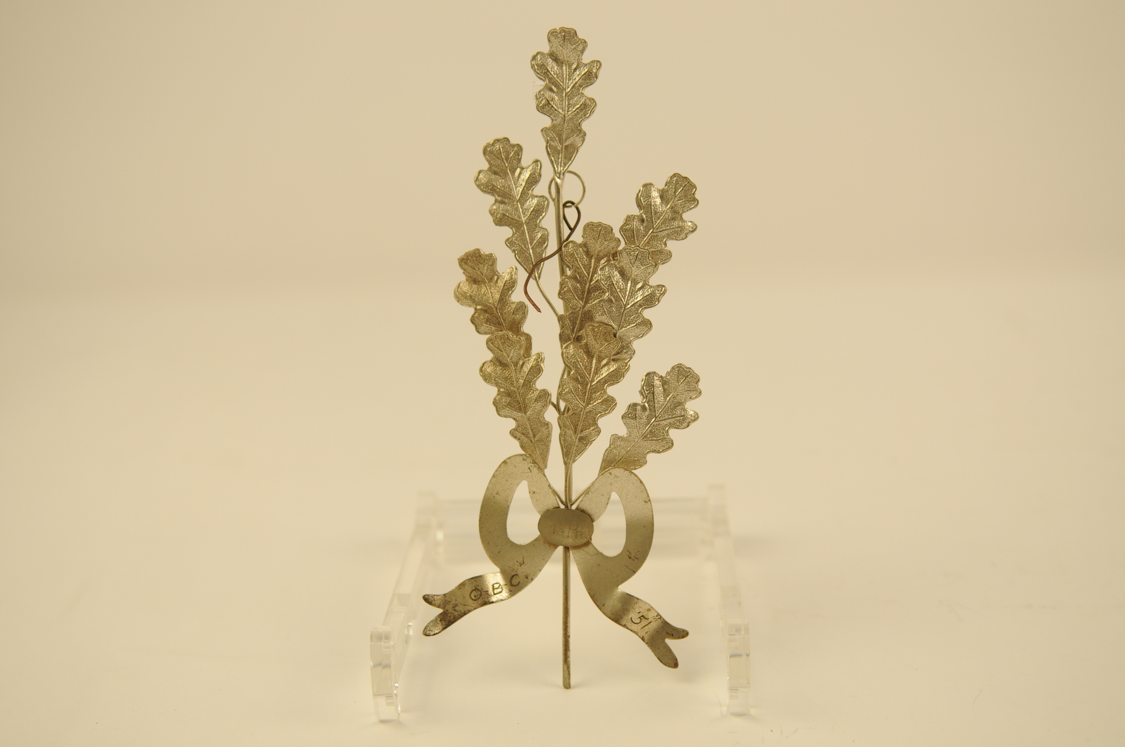 Lauwertak - 1951, materiaal: metaal, verzilverd (?), afmetingen: 19,5 x 8 x 1 cm, negenbladige lauwertak met eiken-blad en symmetrisch uitgewerkt banderole-lint met de inscriptie: ‘O.B.C. 1E Pr. ‘51’