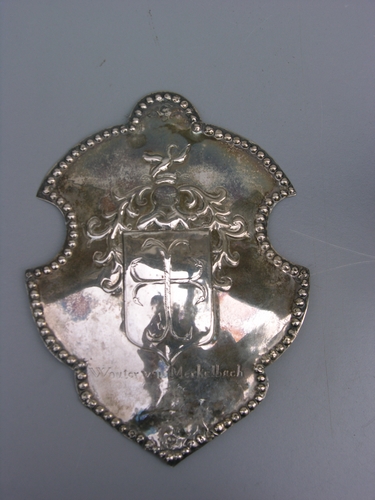 Zilveren schild met ingehamerd wapen in een puntig uitlopend schild met elkaar kruisende ankermotieven waarbij de gebogen uiteinden in vogelkopjes eindigen. Het gehel bekroond door sierlijke acanthusbladeren in symmetrie en ridderlijk motief met bovenaan een zwaan. In top een drietal zilvermerkjes. Onder het familiewapen een inschrift: 'Wouter van Merkelbach 1711' Langs de rand een omlopend ...