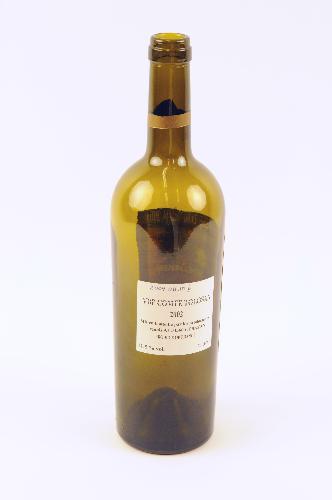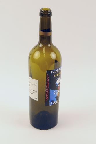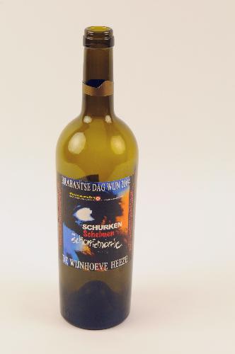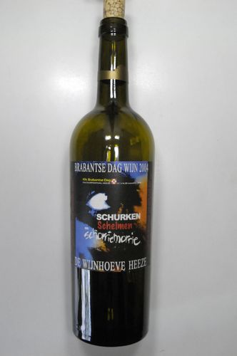Wijnfles Brabantse Dag Wijn - 2004, groen glas, 30 x 7,5 cm, wijnfles met etiket '47e Brabantse Dag Cultuurfestival te Heeze 21 t/m 29 augustus 2004, thema “Schurken, schelmen en schorriemorrie”', (fles bevatte oorspronkelijk 75 cl vin de Pays Comte Tolosan 2002)