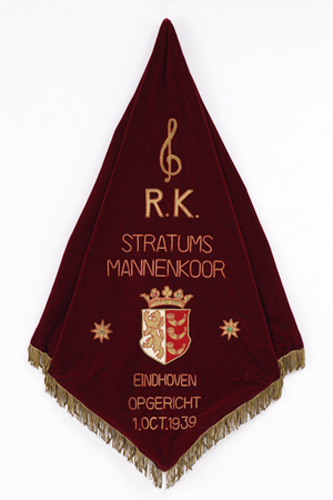 Vaandel van het Rooms-Katholiek Stratums Mannenkoor - 1939, materiaal: fluweel, kleur: donker rood, lengte 158 cm, breedte 96 cm (exclusief franje), een trapezoïdaal vaandel van rood fluweel met borduurwerk en applique, opschrift uitgevoerd in borduurwerk: '(G-sleutel), RK STRATUMS MANNENKOOR' (stadswapen van Eindhoven met kroontje, geflankeerd door 2 achtpuntige sterren), 'EINDHOVEN OPGERICHT 1 OCT. 1939', achterzijde ...