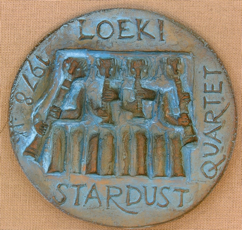 Penning, terracotta, blauw/zwart beschilderd, , met een reliëfafbeeling van een viertal zittende blazers/fluitisten in een vierkante uitsparing, reliëfopschrift “LOEKI STARDUST QUARTET 1978”, gemonogrammeerd l.m.:“F g-sleutel H”