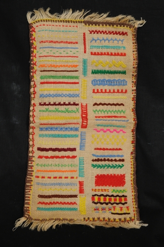 Proeflap met steken op jute – 1947/1949, materiaal: jute, katoen en wol , kleuren: ecru (jute), rood. blauw, groen, geel, rose en bruin, afmetingen: 49 x 24 cm, met wokl zijn er allerlei steken en randen geborduurd in diverse kleuren Vervaardiger is Mevr. Leida van Dijk-Kerkhof, geboren in 1935, na de zesde klas heeft ze 3 ...