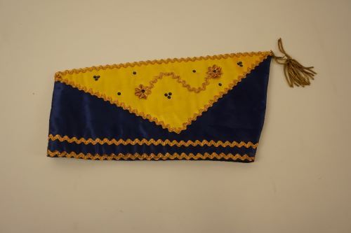 Carnavalssteek in Blauw/Geel/Goudborduursel met flos aan voorzijde van de Carnavalsvereniging van de ABN Bank. In de voeringrand aan binnenzijde het firma-etiket: 'Govers-Vos Eindhoven'. Opschrift Positie: binnenzijde Opschrift Type: etiket Opschrift Inhoud: "Govers-Vos Eindhoven".