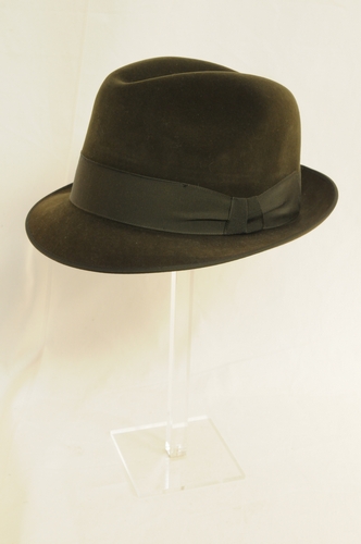 Herenhoed, materiaal: wol/vilt, kleur: jagersgroen, Lengte 28,5 cm, breedte 25 cm, hoogte 13 cm. bijzonderheden; Merk 'Jean Peille' verwerkt in bol binnenzijde en gestempeld in de binnenrand 'Jean Peille Jos. van Dijck Bakkerstraat 12 Utrecht'. Ribslint om bol, 3,8 cm breed. Rand afgeboord met ribslint. Kaartje in lint: mt 55 149,00
