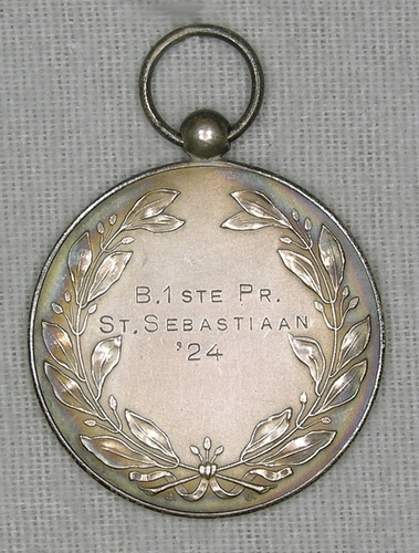 Prijspenning handboogvereniging - 1924, metaal/verzilverd, 47 x 34 x 1 mm, vz.: twee staande handboogschutters waarvan een met gespannen boog en schietschijf, az.: inschrift ´B. 1ste Pr. St.Sebastiaan '24´, daaromheen gebogen lauwertakken en cirkelrank, gemonogrammeerd: ´B.U.´
