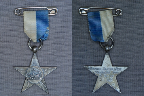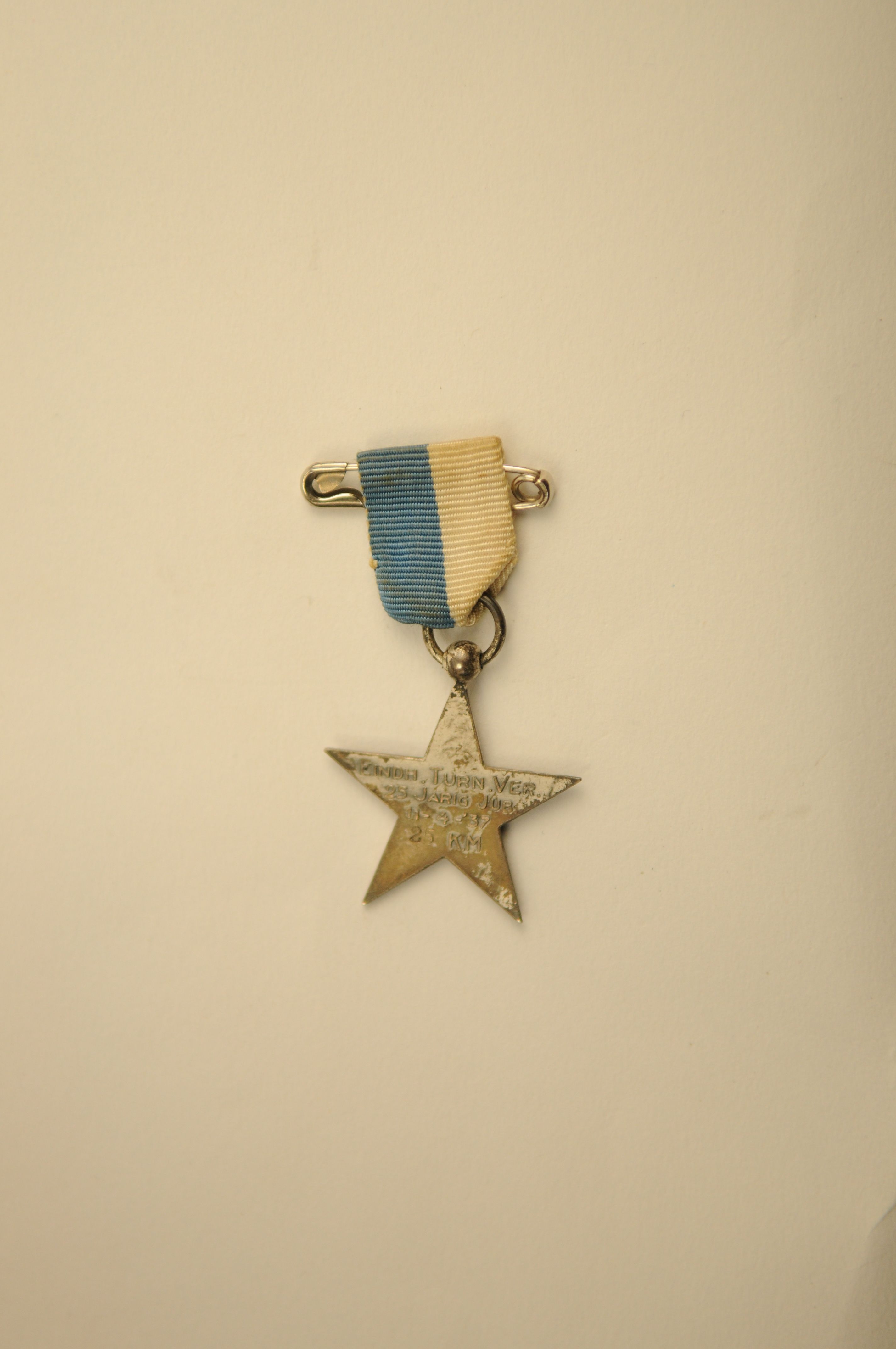 Medaille 'Eindhovensche Turn Vereeniging 25 Jarig Jubileum 11-4-'37 25 k.m.' - 1937, materiaal: geanodiseerd metaal, afmetingen: 3,8 x 3,5 x 0,2 cm, medaille in de vorm van een vijfpuntige ster met circelvormig middengedeelte waarop in reliëf de voorstelling van een schip op het water. Opschrift (in kapitalen) op de achterzijde: 'Eindh. Turn Ver. 25 Jarig ...