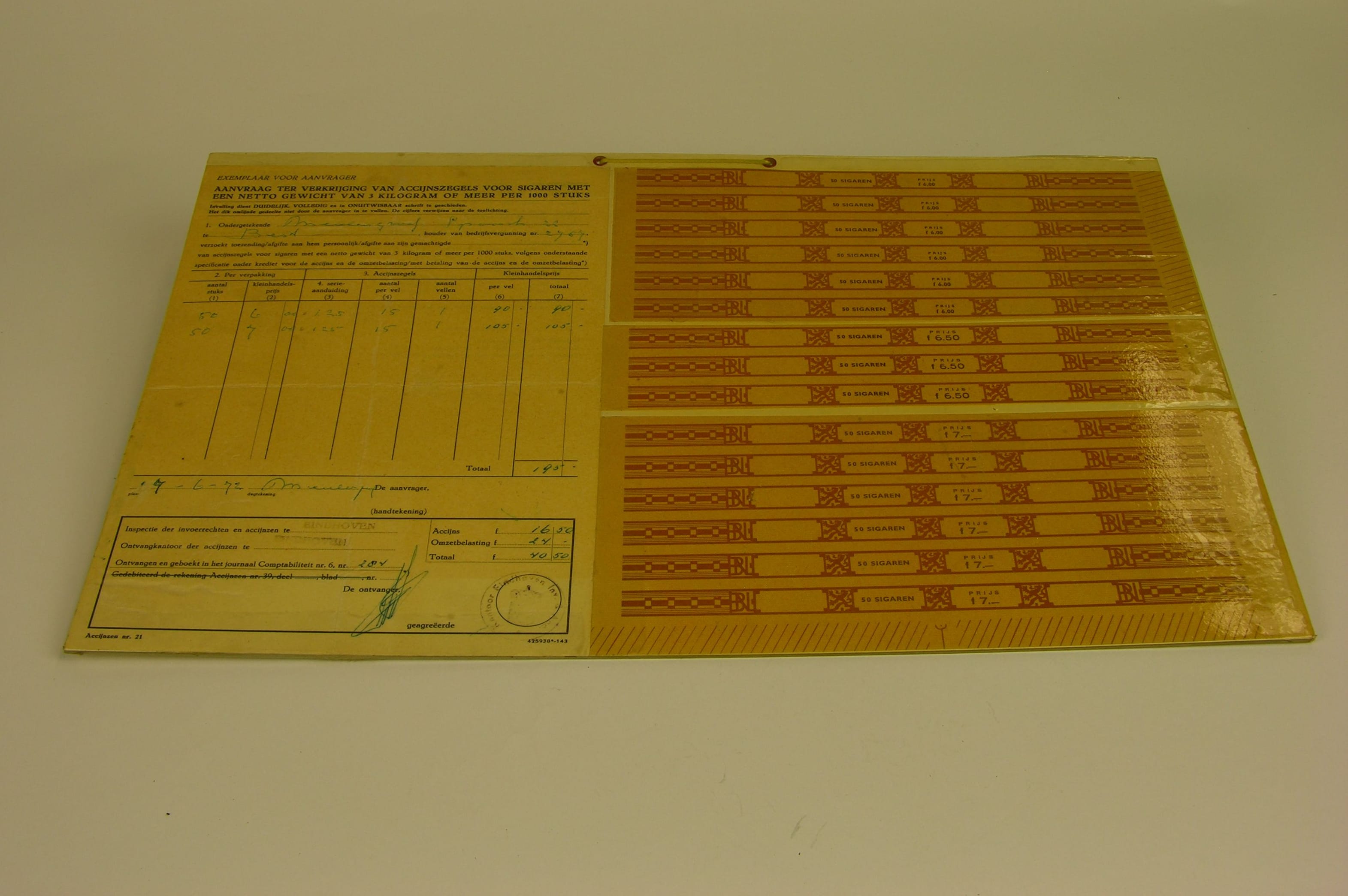 Aanvraag ter verkrijging van accijnszegels voor sigaren - 1972, materiaal: papier op karton/geplastificeerd (formulier en zegels), afmetingen: 49 x 30 x 0,2 cm, aanvraag ten name gesteld van Meulengraaf, Best