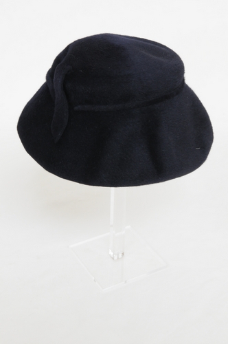 Dameshoed, materiaal: haarvilt, kleur: donkerblauw, afmetingen: 18,5 x 33 cm, versierd met viltbiesje en lintje en afgezet met ribslint, machinale confectiehoed
