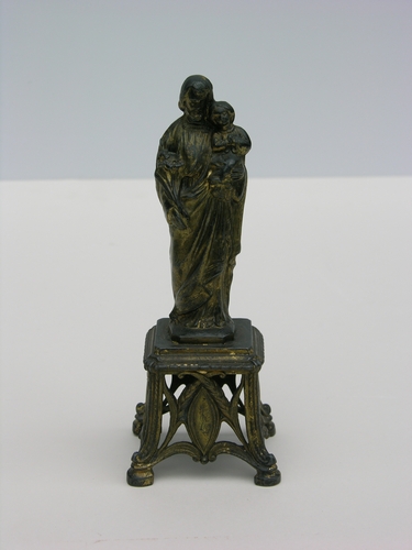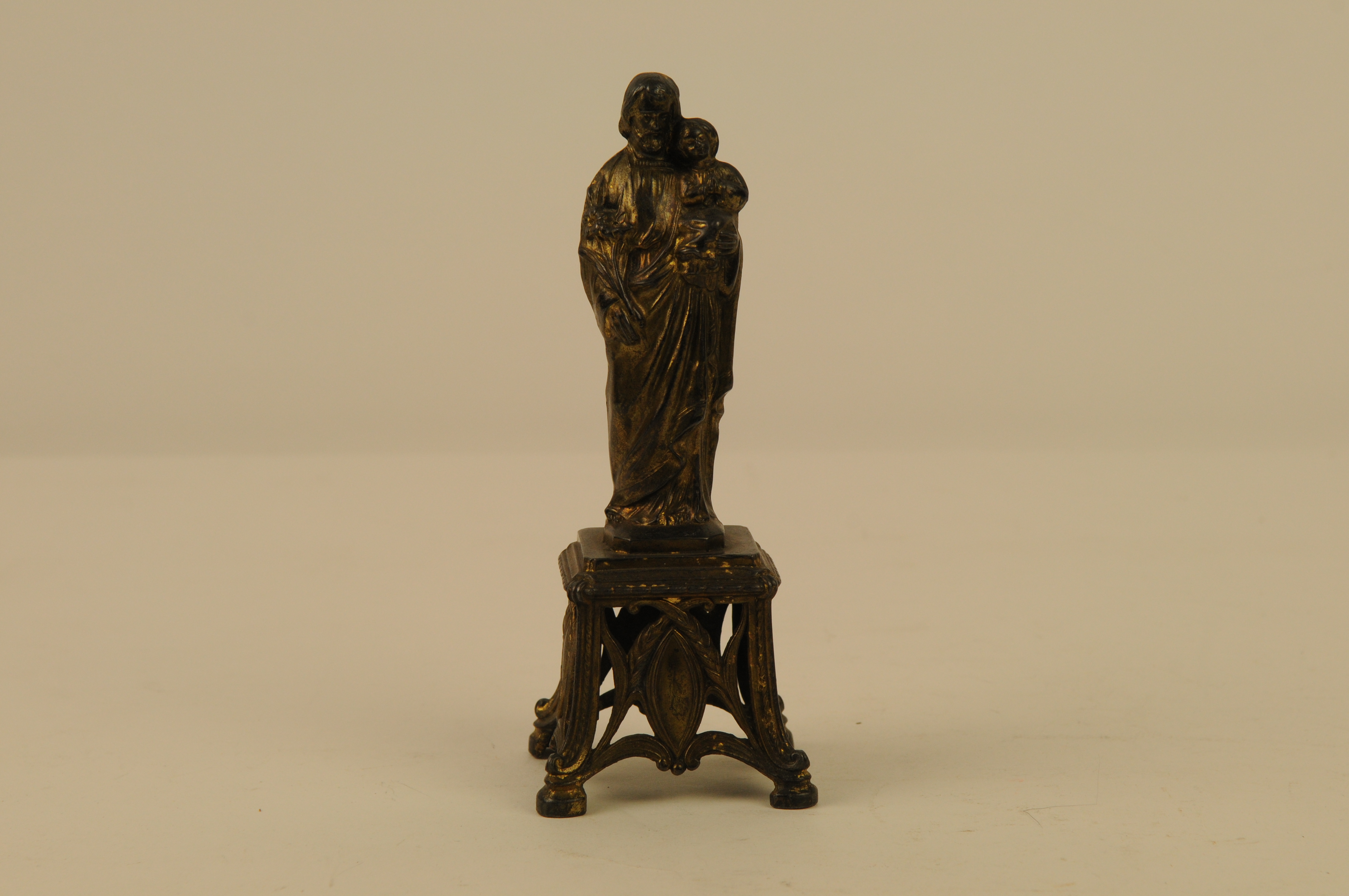 Beeld voorstellende Sint Jozef met Kind op verhoogde pedestal in een hol gegoten legeringsvorm. Het kind op de linkerarm, in de rechterhand een lelietak.