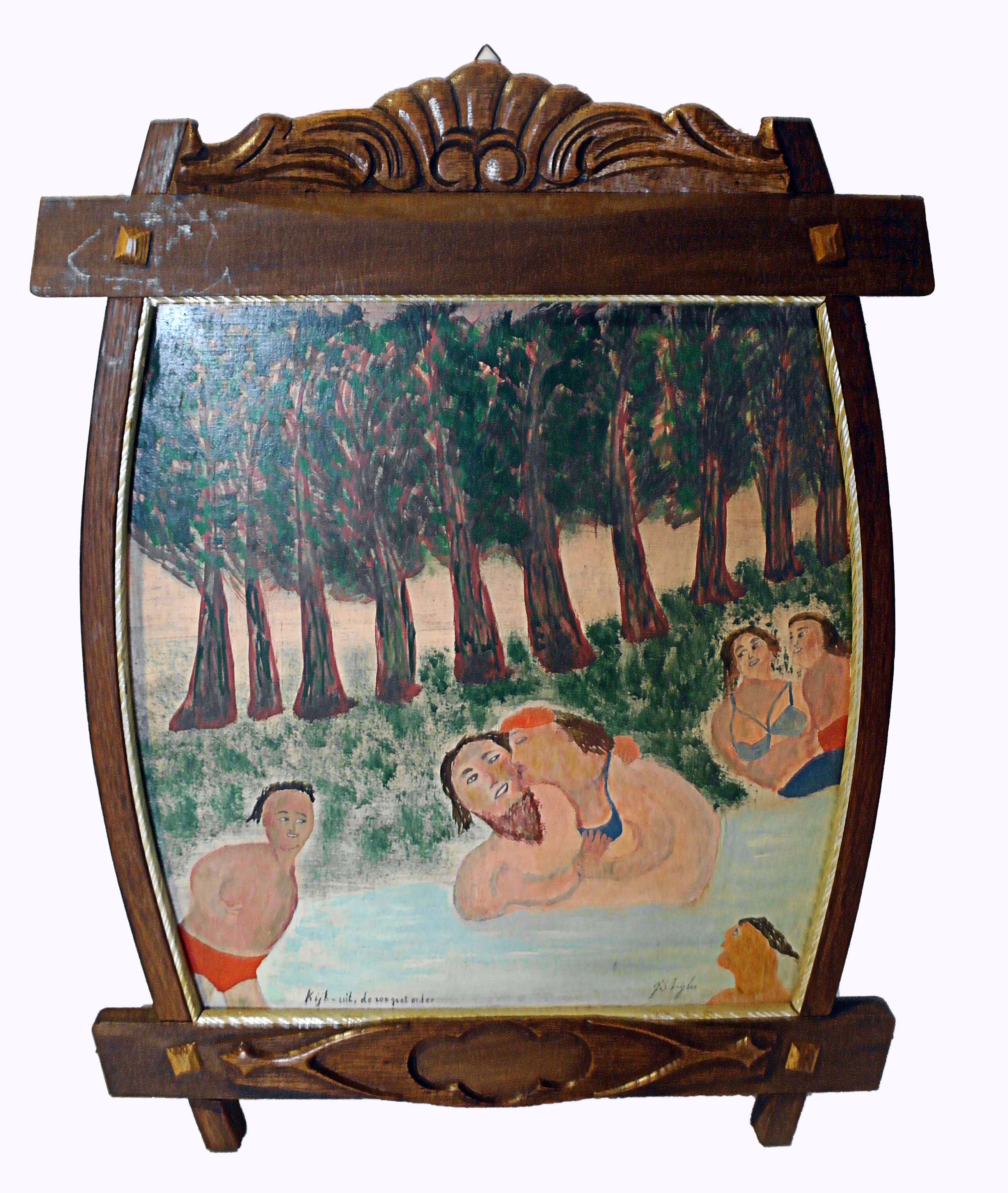 'Kijk uit, de zon gaat onder', olieverf op hardboard, 41 x 40 cm, gesigneerd r.o.: J. Strijbos, getiteld l.o., in houten lijst