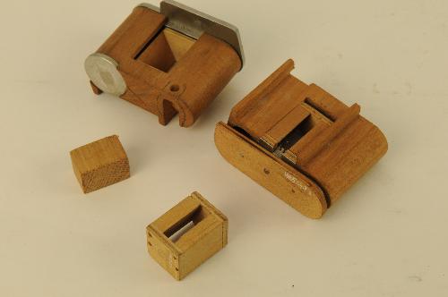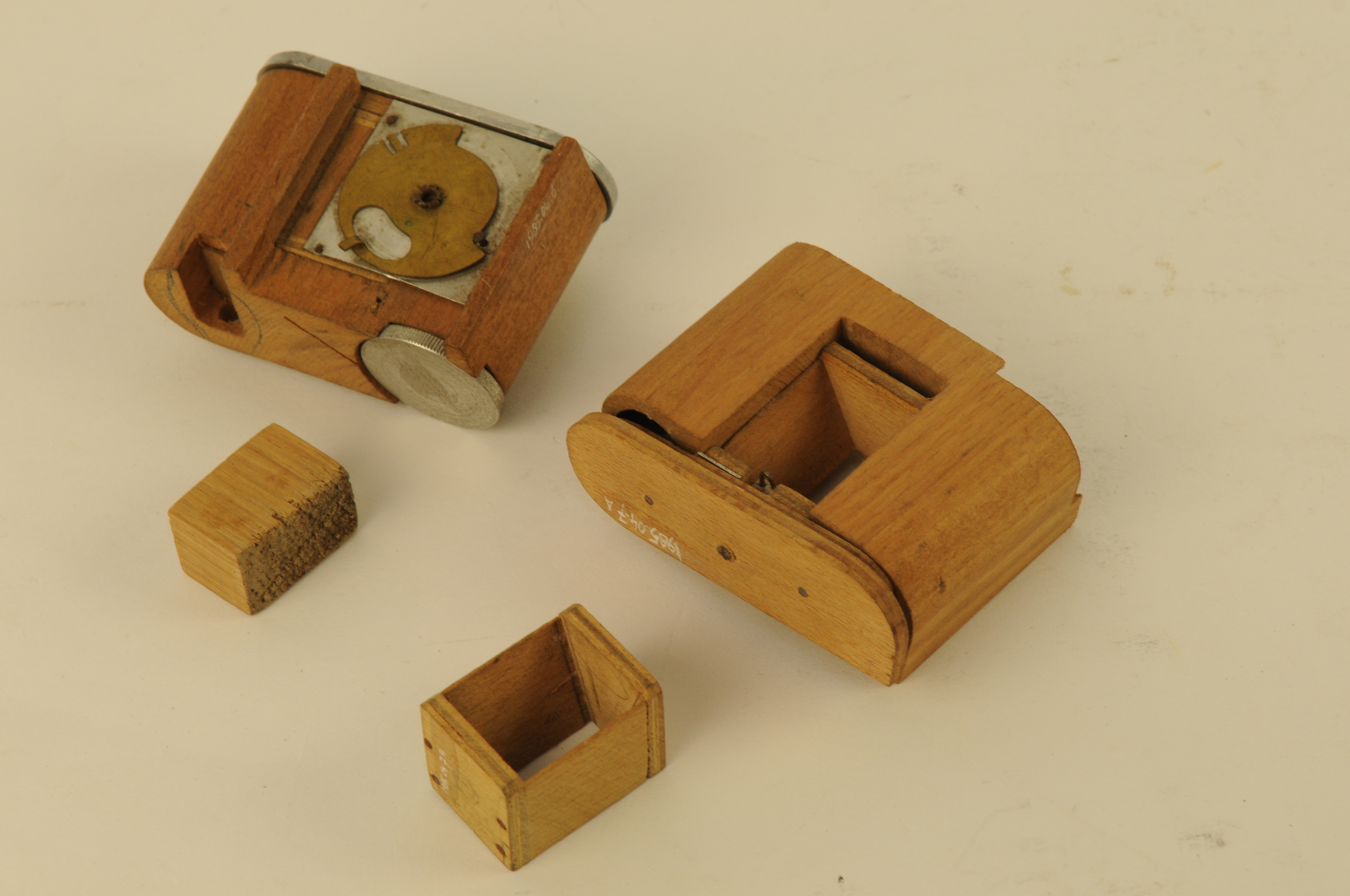 eenvoudig houten fototoestelletje als prototype van houten fototoestellen die de firma 'Geem' kort na WOII dacht te gaan produceren. Begeleidende brief Firma 'Geem' N.V. Houtwaren-Industrie, Julianastraat 50-52 Eindhoven 13-07-1950. zie ook inv.nrs 1985.04.05, 1985.04.7a, 1985.04.8a en 1985.04.8b