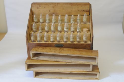Opbergkistje voor monsters - eerste helft van 20e eeuw, hout en glas, afmetingen: 22,5 x 22,5 x 12 cm, 4-laags getrapt opbergkistje, met als inhoud diverse met vloeistof gevulde reageeerbuisjes, met het firma-naamplaatje: 'LAMERIS - UTRECHT - INSTRUMENTEN'