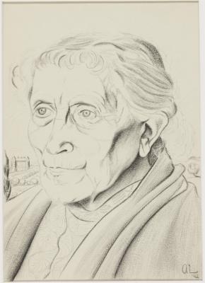 De freule - 1942, contékrijt/papier, 30.3 x 21.4 cm, gemonogrammeerd en gedateerd r.o.: AL '42. Op de achterzijde: 'Mevr. Jansen Veghel'.